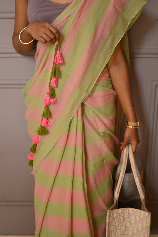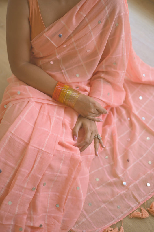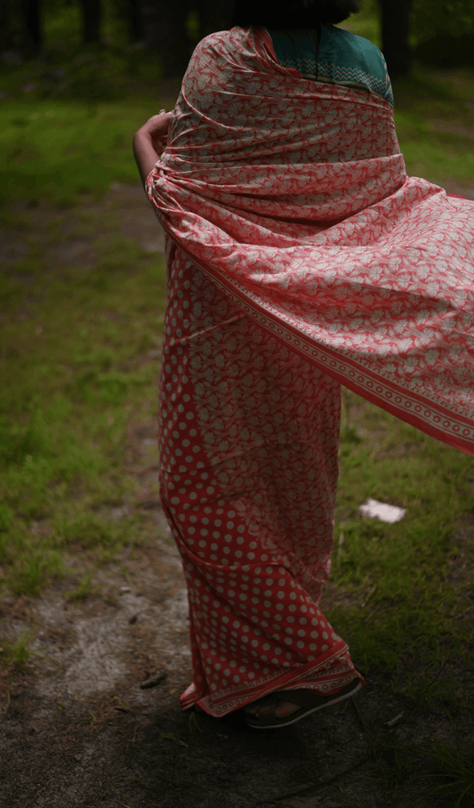 Coral Handwoven Handprinted Muslin Saree