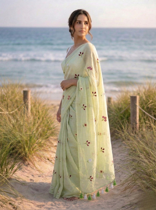 Sold outGardenalia Pista - Hand Embroidered Mulmul Cotton Saree
