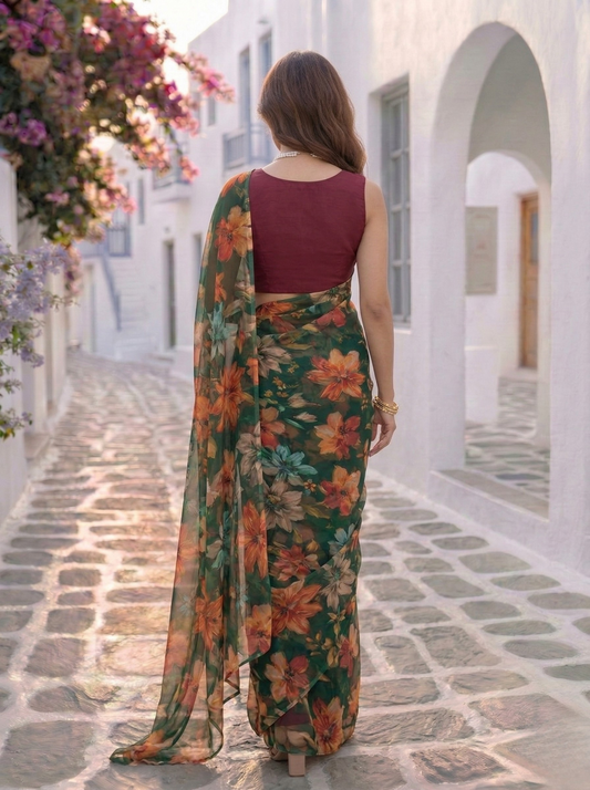 Whether it's a Sunday brunch or a casual office day, a chiffon floral print saree is your go-to outfit. Pair it with a simple pearl necklace for a sophisticated daytime look, or dress it up with a sleeveless blouse for an evening soiree. Effortless, chic, and timeless.