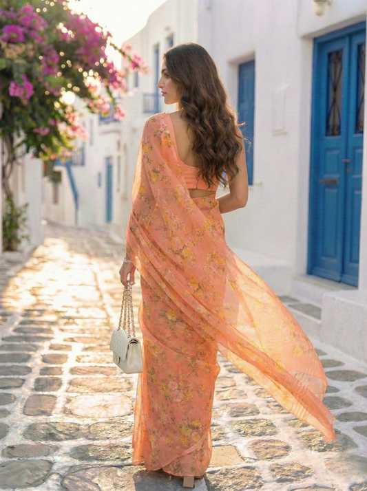 -32% OFF7 reviewsElara - Peach Floral Print Pure Chiffon Saree