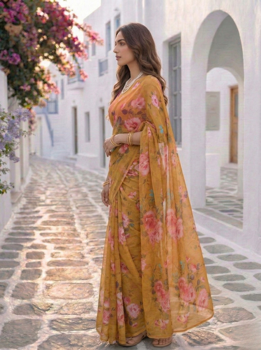 -23% OFFNo reviewsSunlit Rose - Mustard Floral Print Pure Chiffon Saree