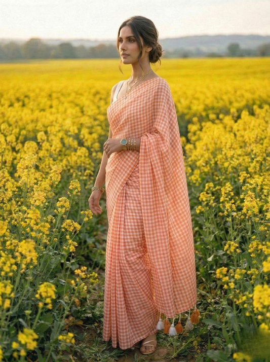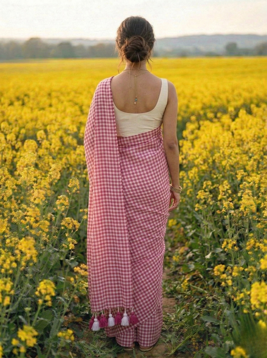 -23% OFFNo reviewsBlush Orchard - Pink Gingham Mulmul Cotton Saree