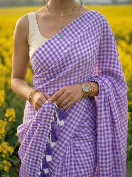 -23% OFFNo reviewsWisteria Lane - Violet Gingham Mulmul Cotton Saree