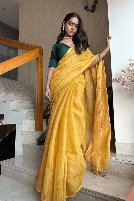 -42% OFFMustard Handloom Linen Tissue Saree