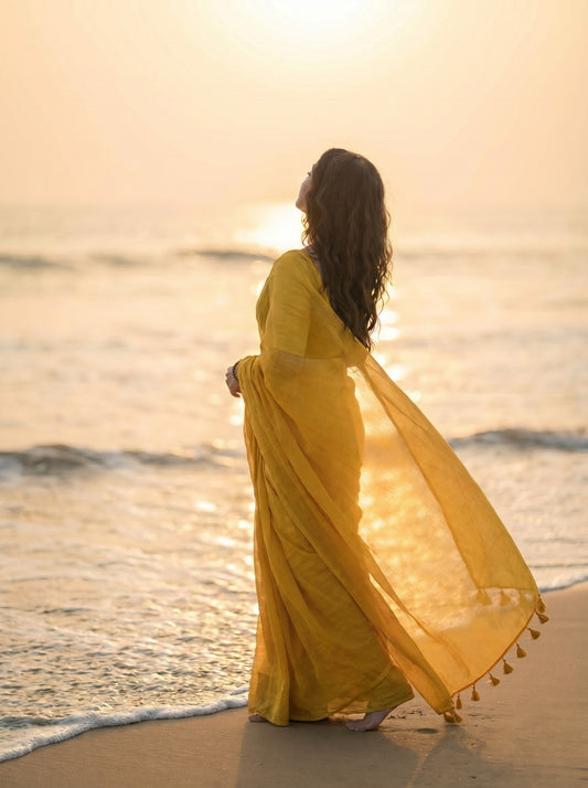 Sold outAmber - Plain Yellow Mul Modal Saree