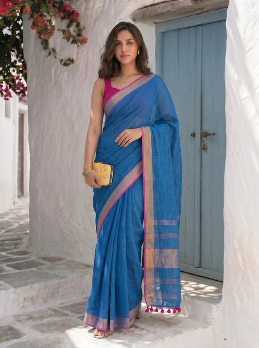 -38% OFF5 reviewsPower Play - Blue Pure Handloom Linen Saree with Zari Border