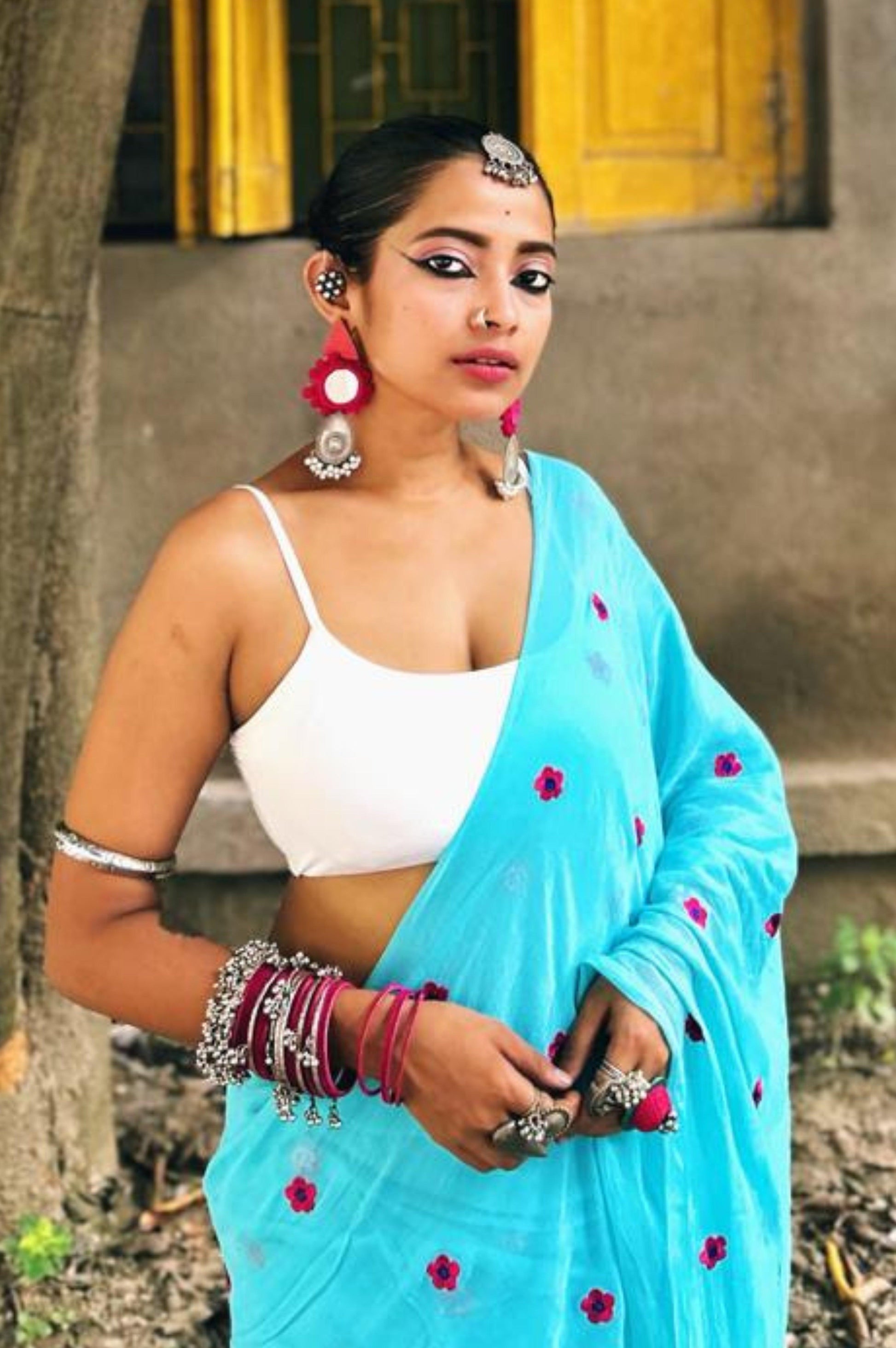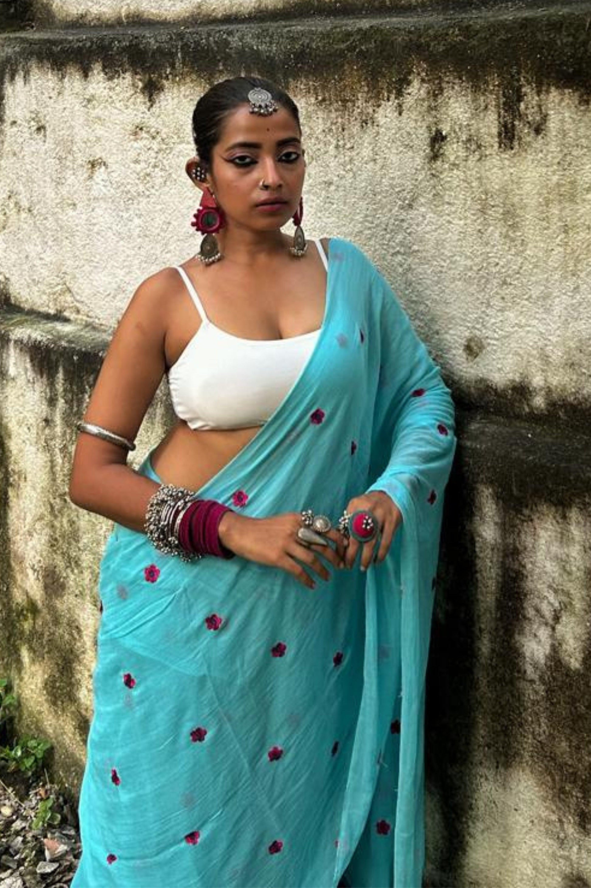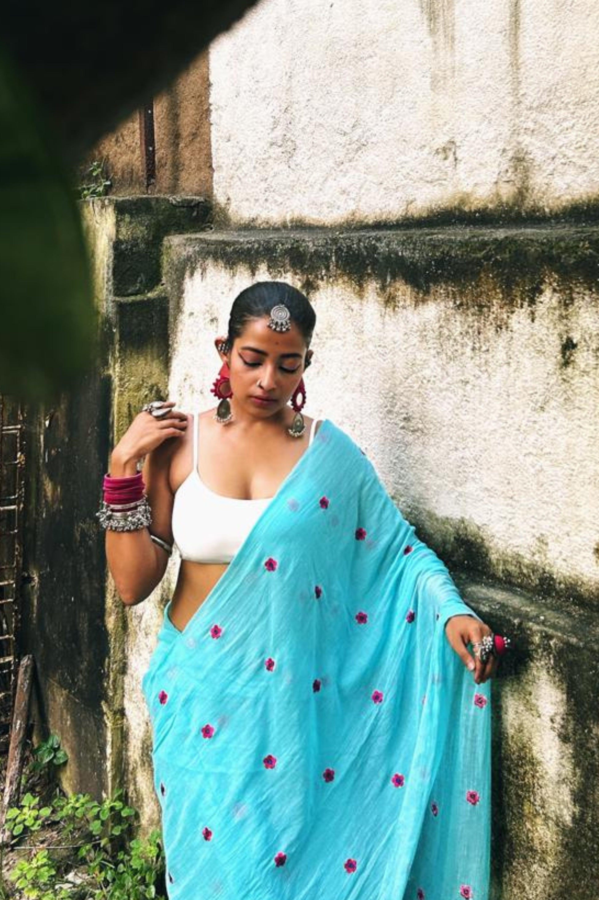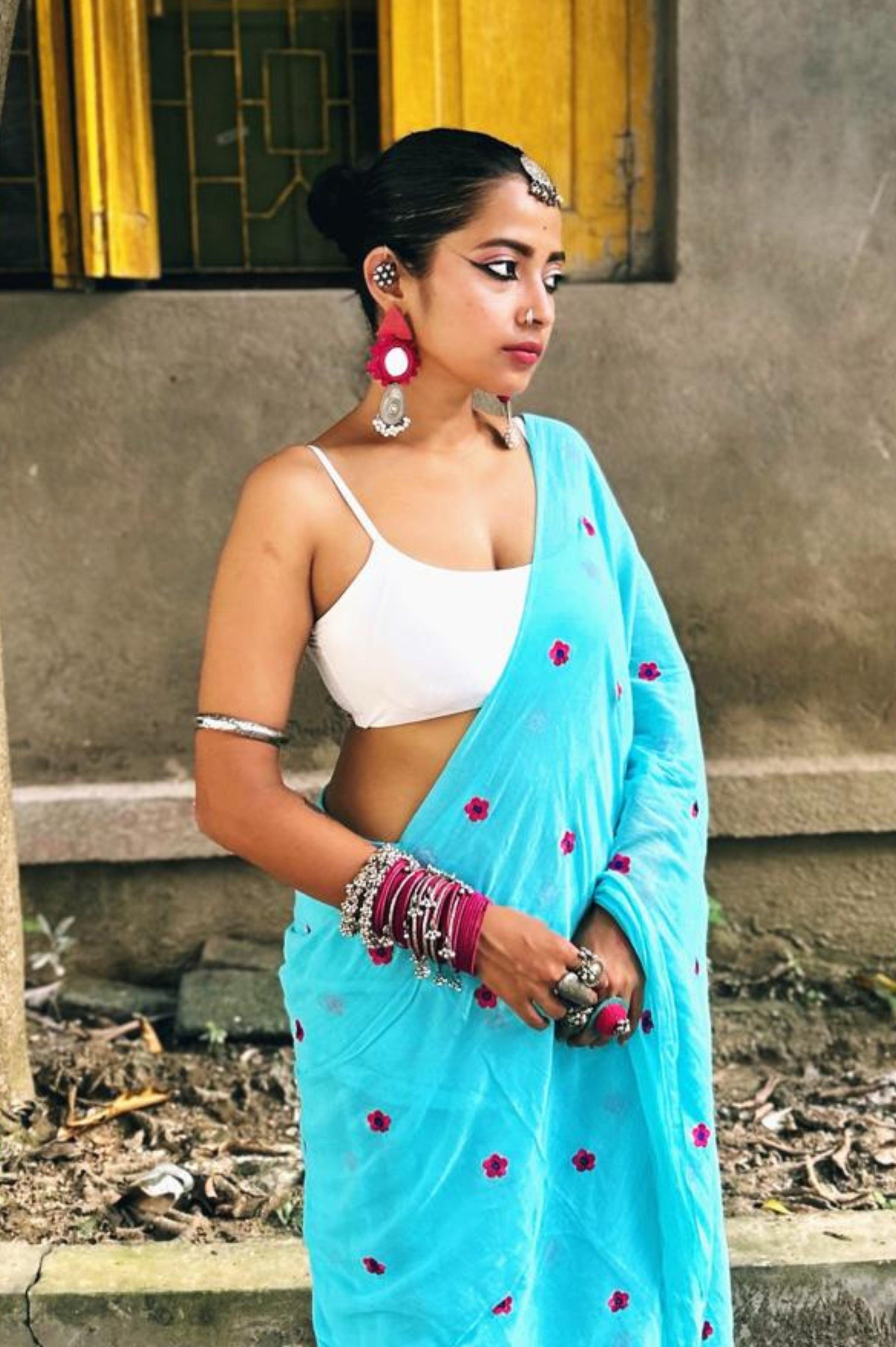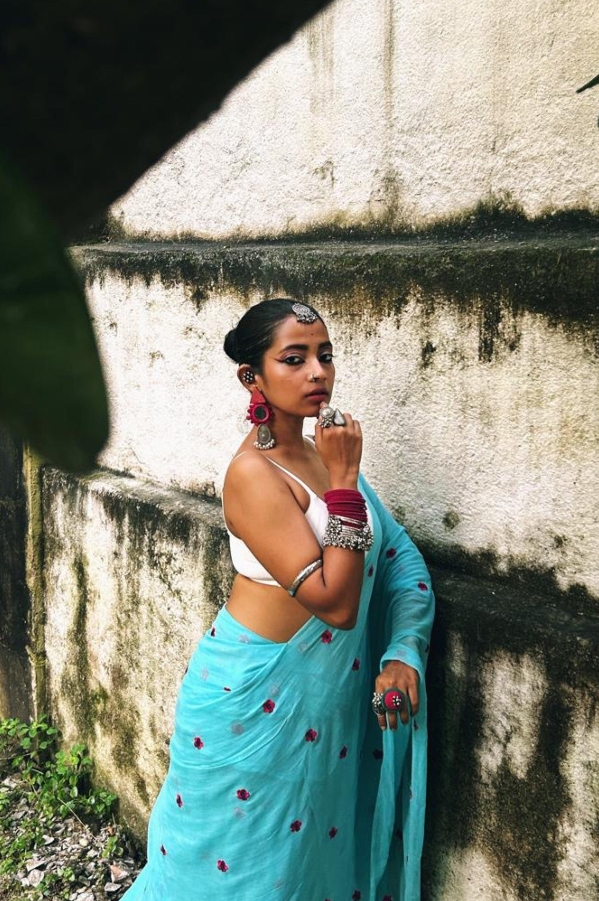 Step into a world of elegance and nature-inspired beauty with our sky blue saree, adorned with delicate forget-me-not pink flowers. This stunning piece captures the essence of a serene garden, making it perfect for both casual outings and special occasions. The soft, airy fabric drapes effortlessly, ensuring you feel as comfortable as you look. The soothing sky blue hue is beautifully complemented by the vibrant pink florals, creating a harmonious blend that radiates freshness and charm. Whether you're attending a brunch with friends, celebrating a milestone, or simply enjoying a day out, this saree adds a touch of whimsy and elegance to any ensemble. Its versatile design makes it easy to style, allowing you to express your unique personality with ease. Celebrate the beauty of nature and enhance your wardrobe with this enchanting sky blue saree—a perfect choice for those who appreciate the art of simplicity and grace.