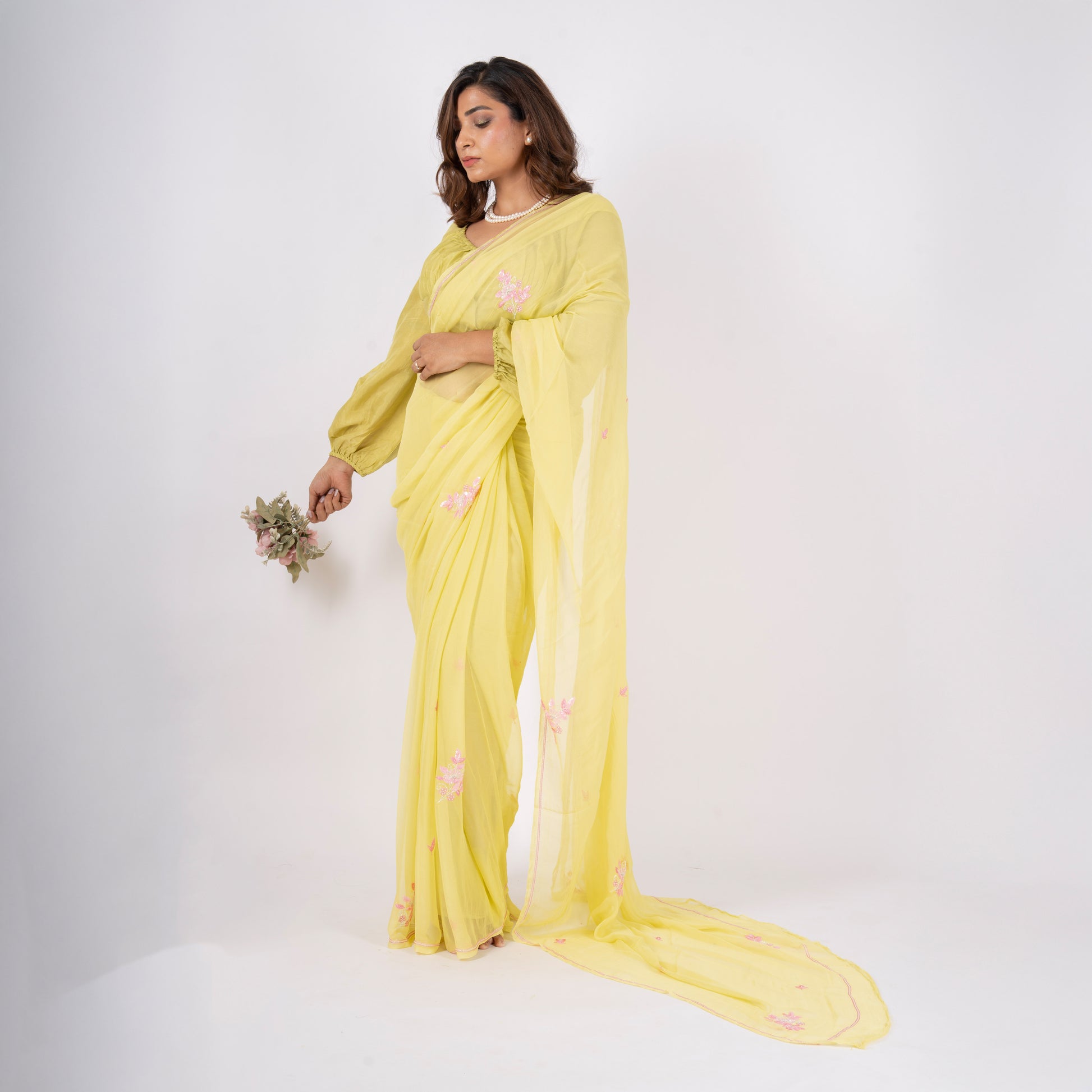 This saree is crafted in Pure chiffon, airy and fluid, in a radiant shade of lime green. The vibrance of the base is beautifully balanced with delicate hand embroidery in navy and pink, adding depth and charm to every fold.