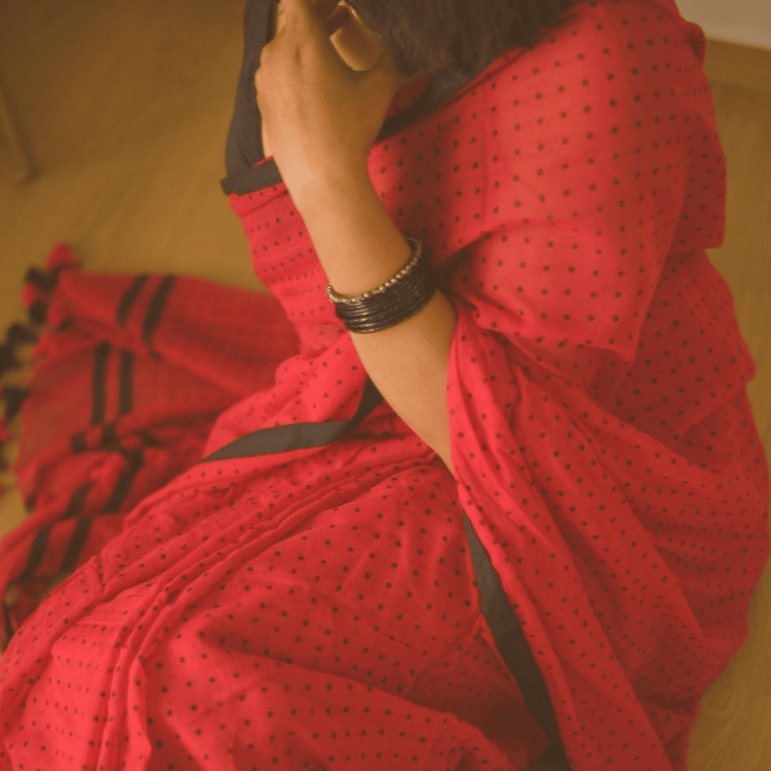 Introducing our ethereal crimson charm Mul Cotton Saree, a timeless masterpiece meticulously crafted with the utmost care and dedication. Handspun & handwoven with the finest mul cotton thread, this saree epitomizes elegance and sophistication.