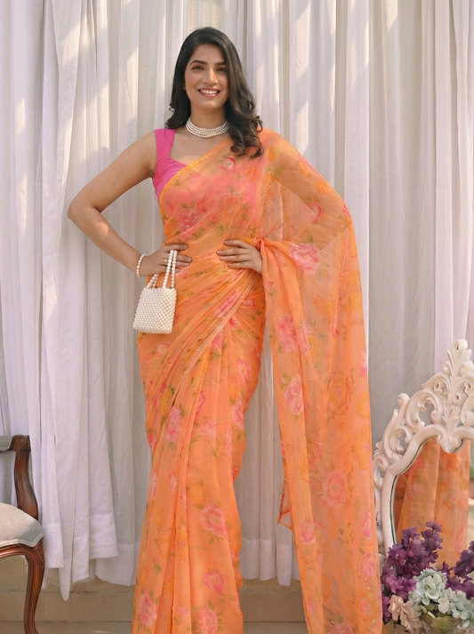 -32% OFF15 reviewsVintage Orange - Floral Printed & Embroidered Chiffon Saree