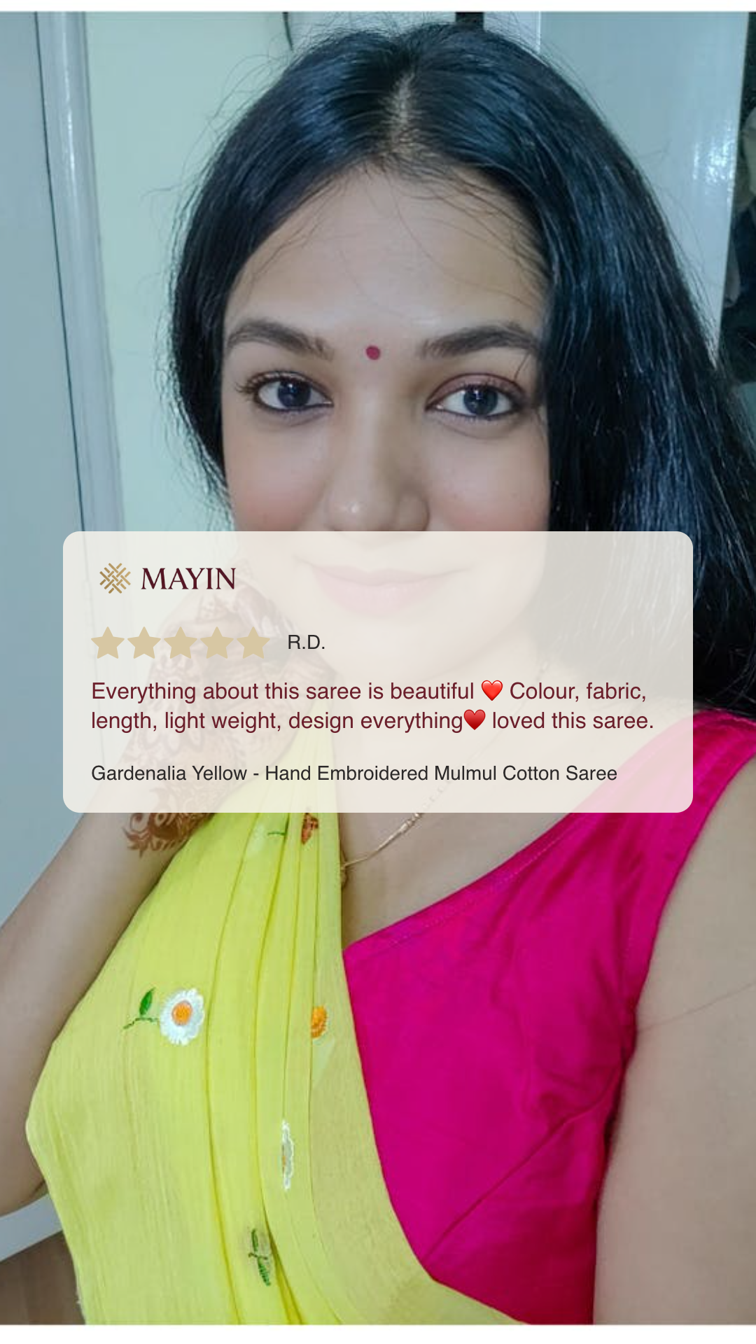 This saree is even more stunning in person. The photos honestly do not capture its glow. The yellow is a radiant sunshine shade that made me feel like a sunflower the moment I wore it. I have never received so many compliments. Even strangers stopped to say something kind. The fabric is beautifully soft and breathable, making it perfect for summer. It drapes effortlessly and falls gracefully, and the length is just right with no constant adjusting needed. What truly delighted me was the intricate floral embroidery across the entire saree, exactly as shown. The detailing adds elegance without feeling heavy. I have made it my 2026 resolution to wear more sarees, and pieces like this make that decision easy. I even gifted a couple to a friend, and she absolutely loved them. Safe to say, Mayin has earned a loyal customer.