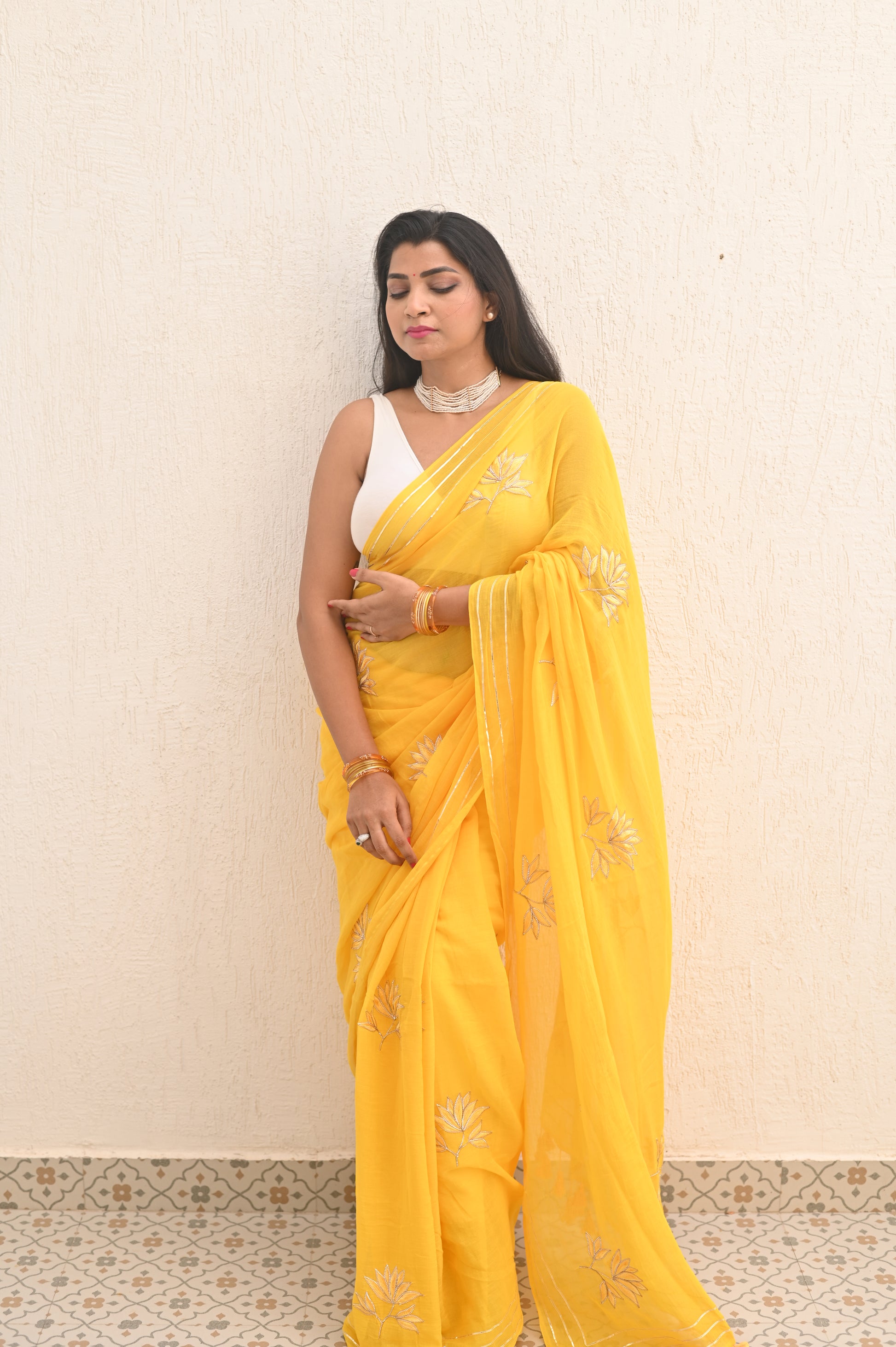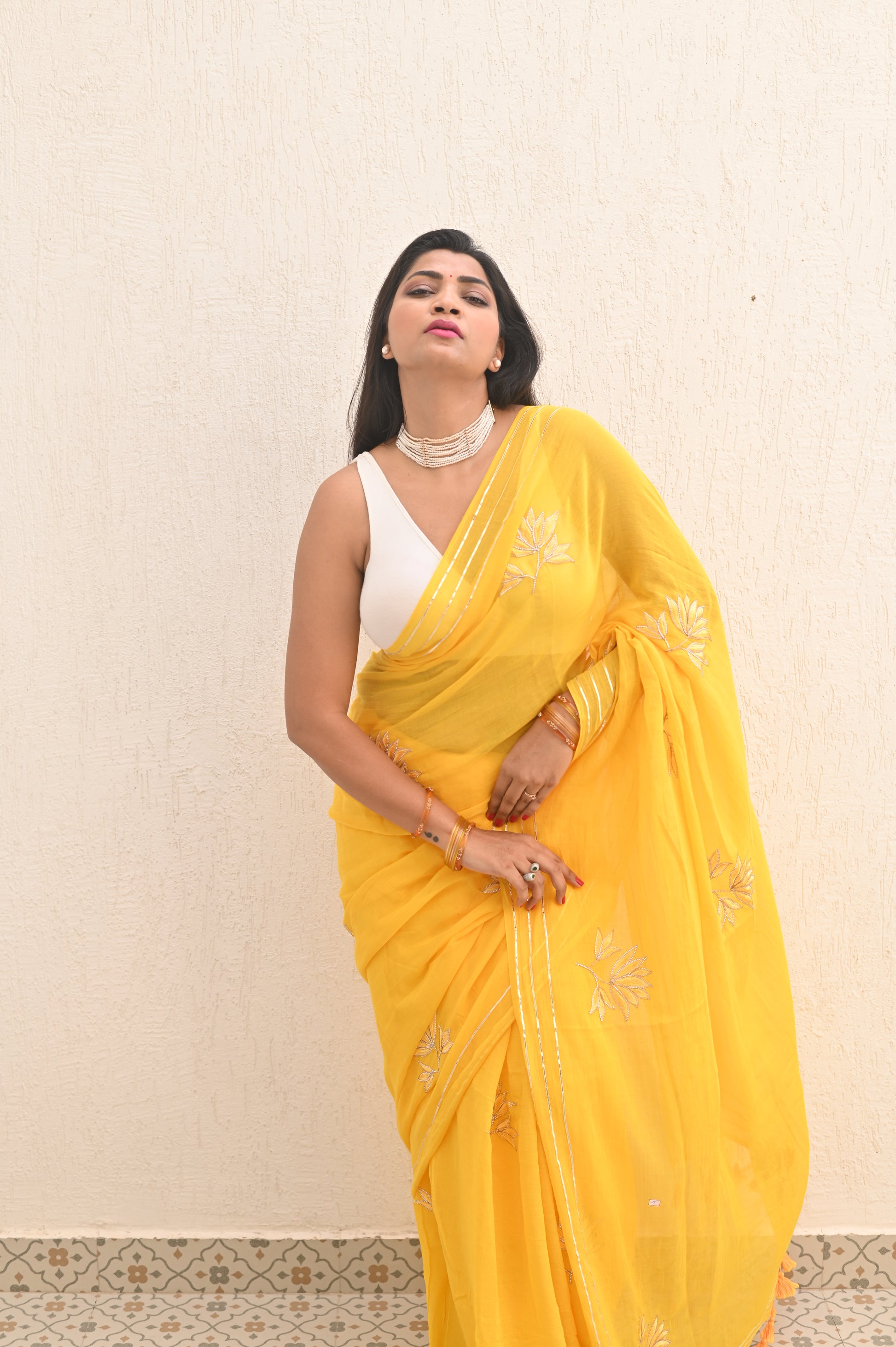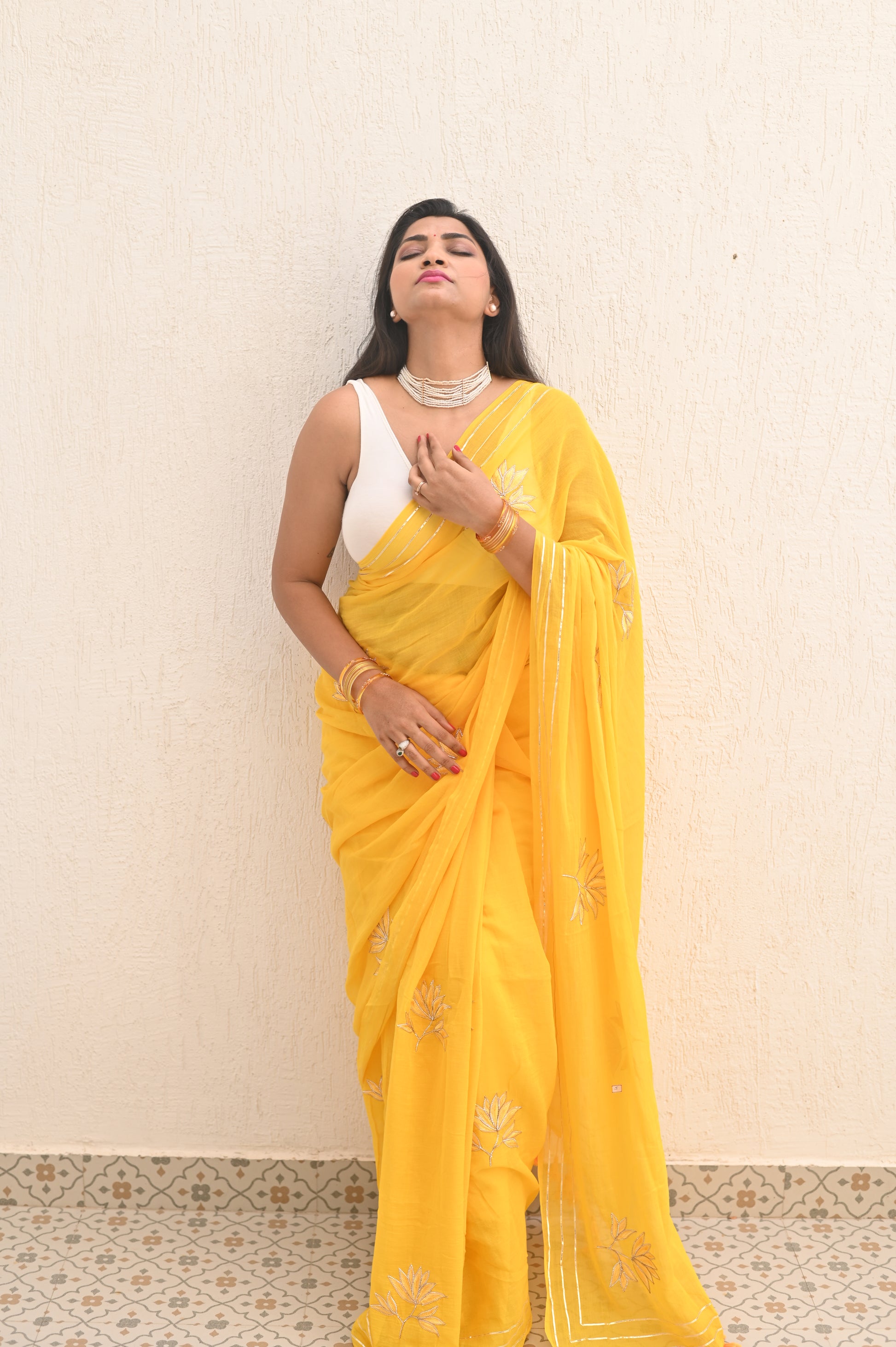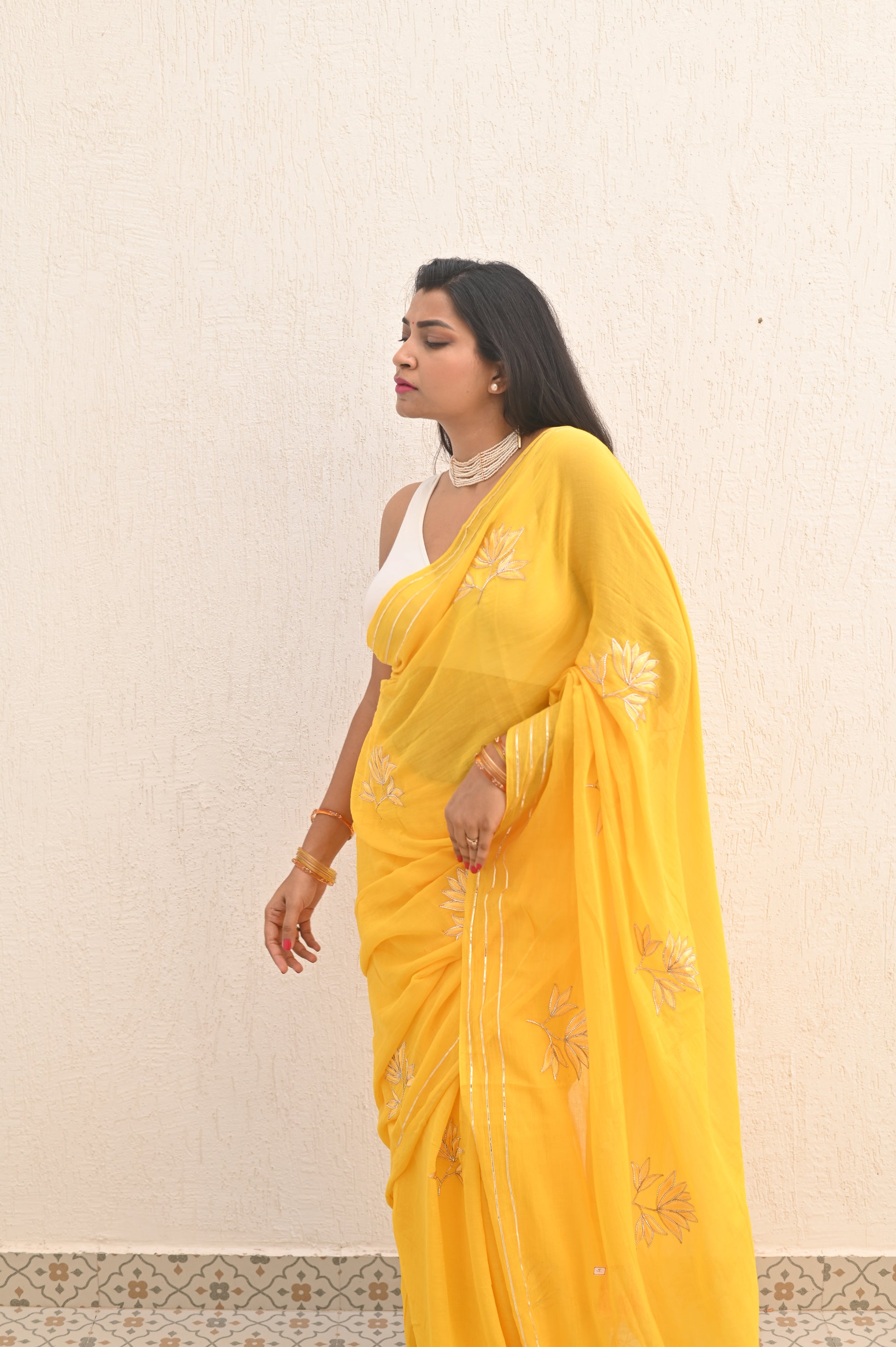 Indulge in the ethereal elegance of olive and figs mulmul saree, a graceful ensemble that epitomizes timeless beauty. Crafted with utmost finesse, this saree is a celebration of delicate craftsmanship and feminine allure. The soft, flowing fabric of mulmul drapes effortlessly, enveloping you in sheer comfort while exuding an aura of sophistication. Its subtle mauve hue evokes sophistication, casting a serene and enchanting spell wherever you go. What truly sets this saree apart are the exquisite floral motifs delicately hand-embroidered across its expanse. Each petal and leaf is meticulously crafted by skilled artisans, infusing the saree with a mesmerizing charm that captivates the beholder. Whether you're attending a daytime soiree or a formal evening affair, this mulmul saree is sure to make a statement. Pair it with minimalistic jewelry for a classic look or accessorize with bold accents to add a contemporary twist.