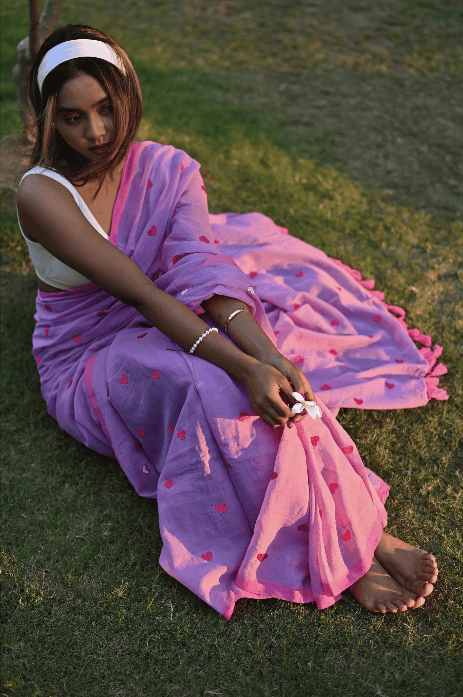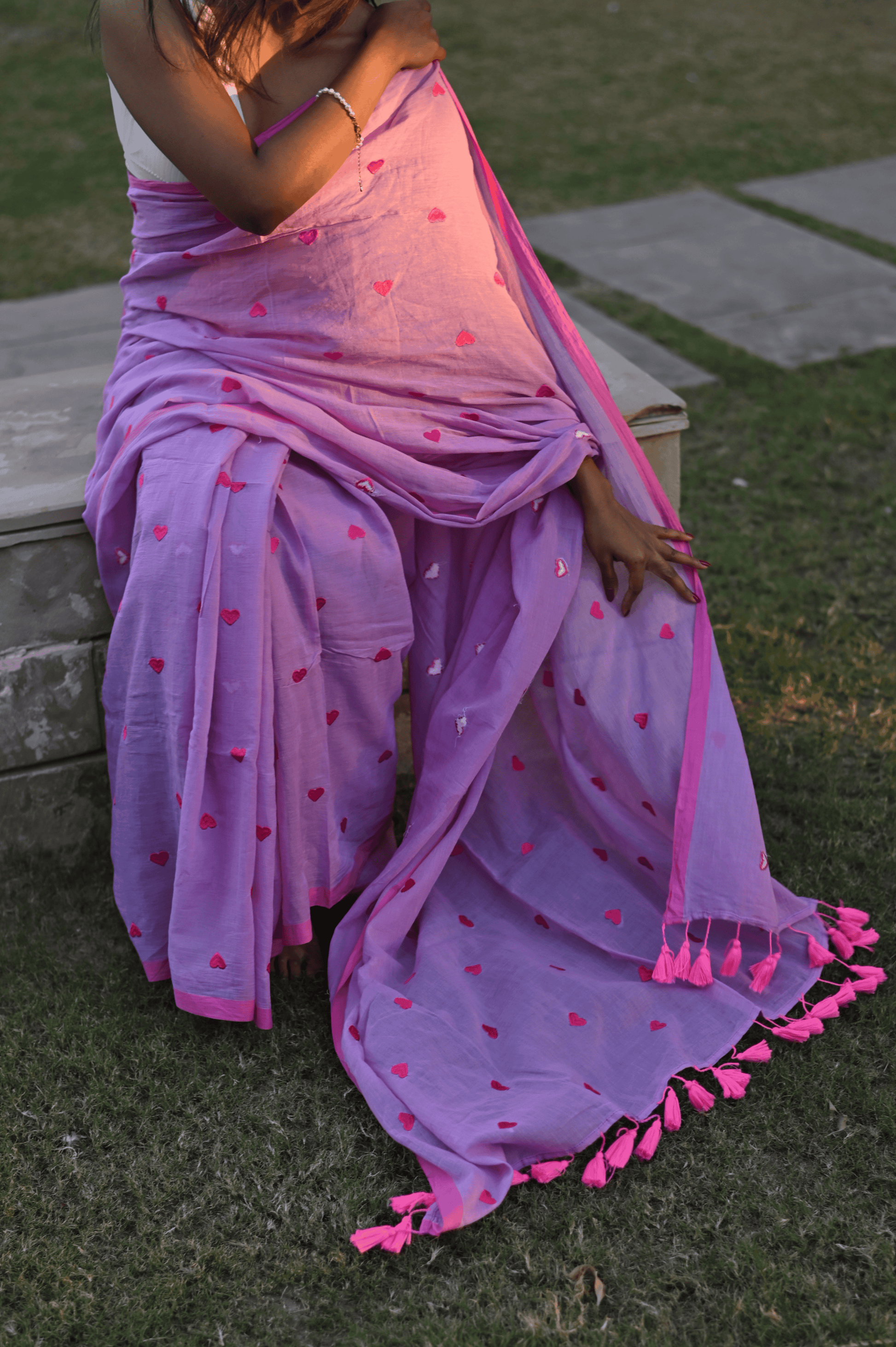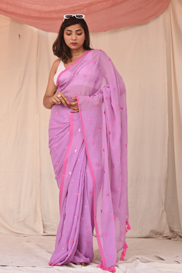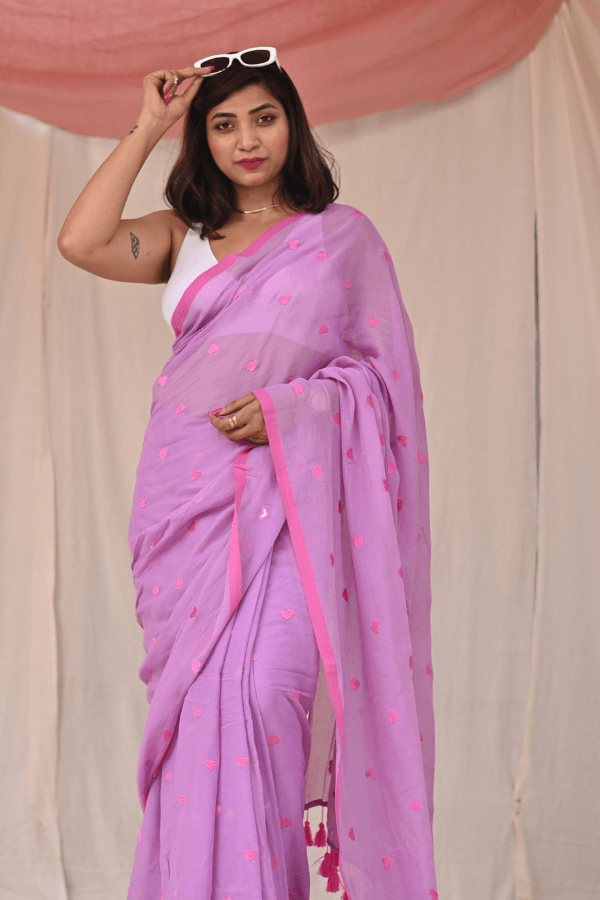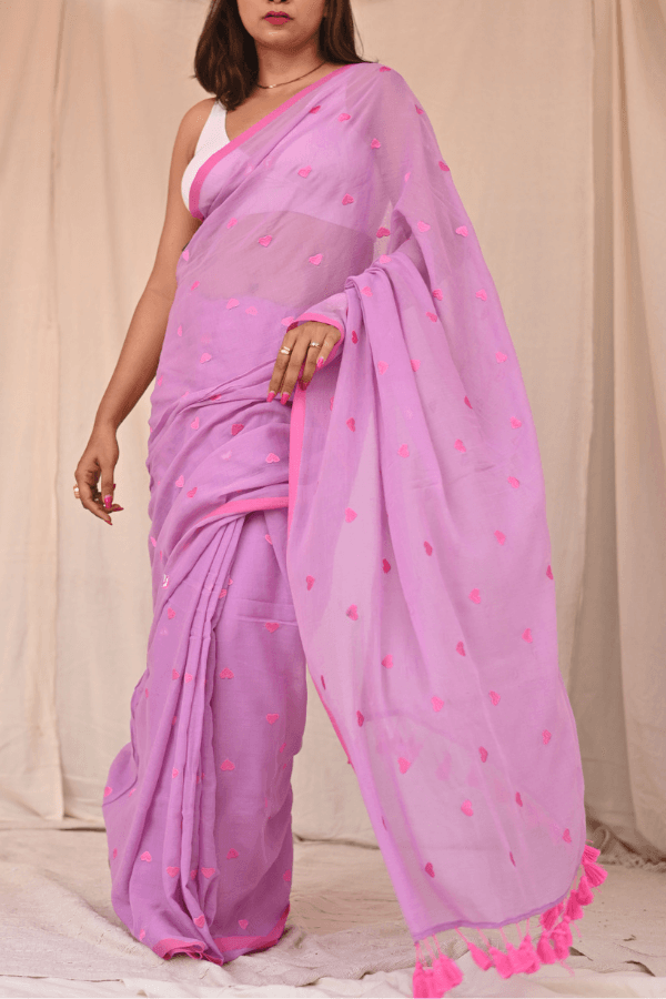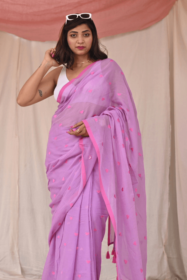 Fall in love with our quirky yet classy pure mul cotton saree, adorned with an enchanting all-over heart embroidery. This unique piece effortlessly blends simplicity with style, making it a standout choice for the modern woman. The soft, breathable mul cotton ensures comfort, while the playful heart motif adds a touch of whimsy. Embrace your individuality with this versatile saree that effortlessly transitions from day to night. The saree is pink and lime green in colour and doesn't come with blouse piece.