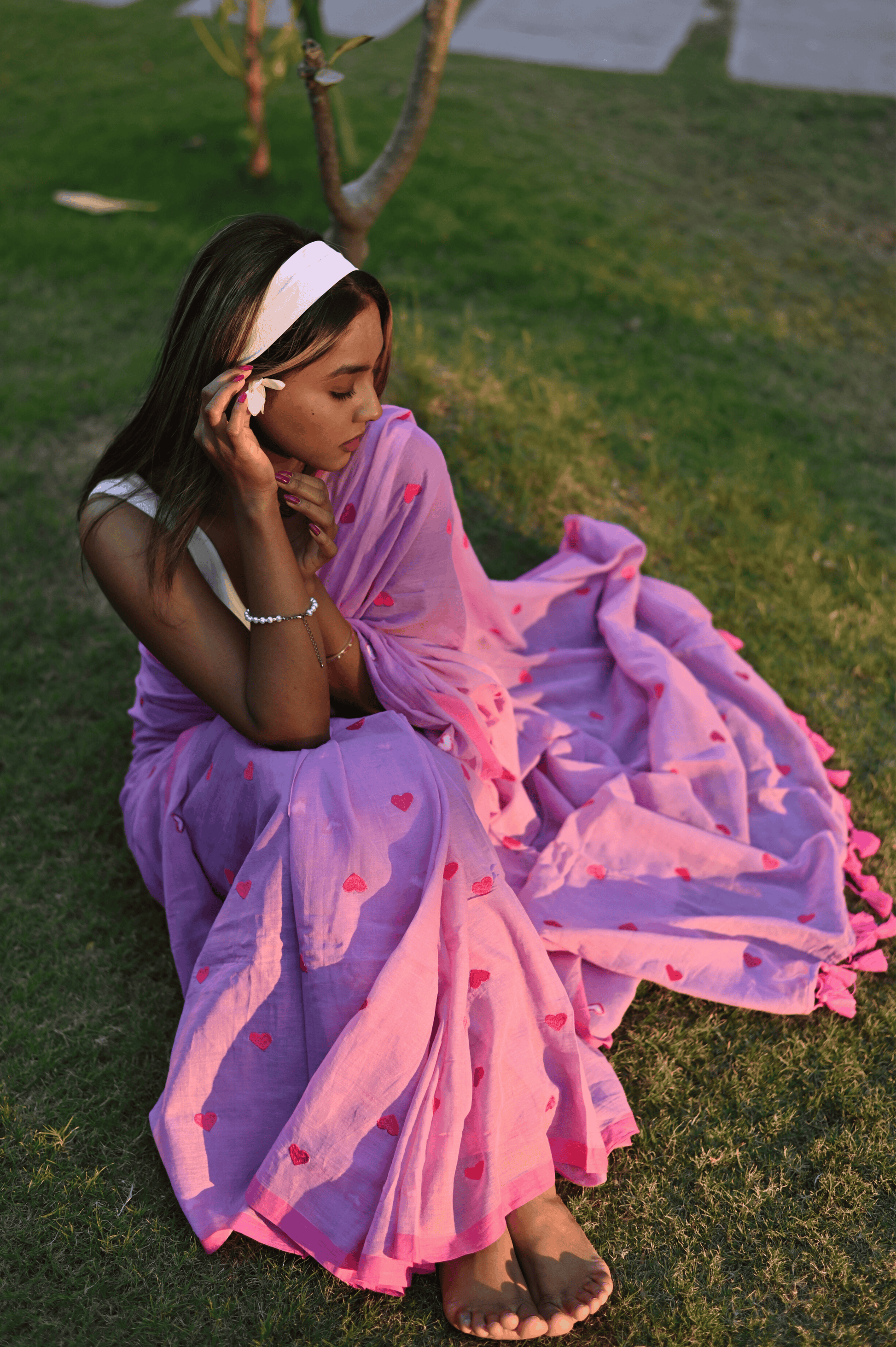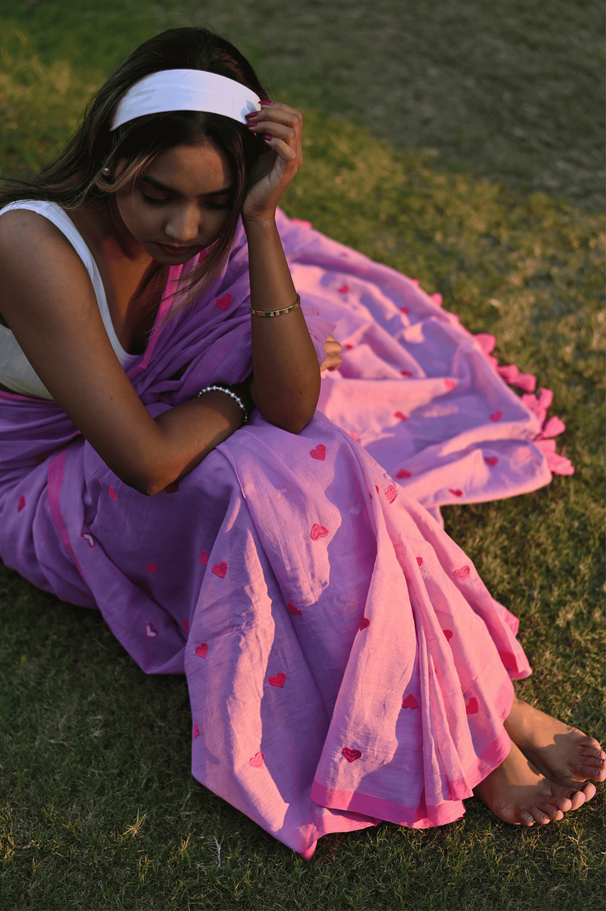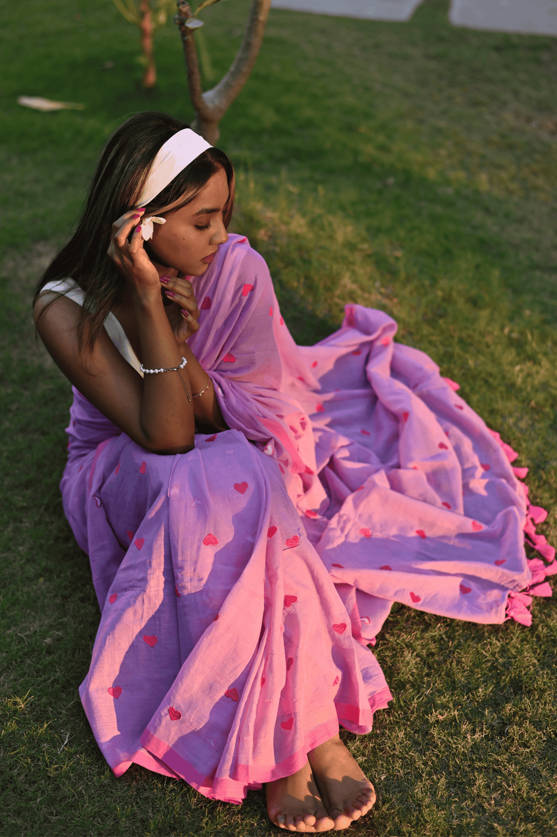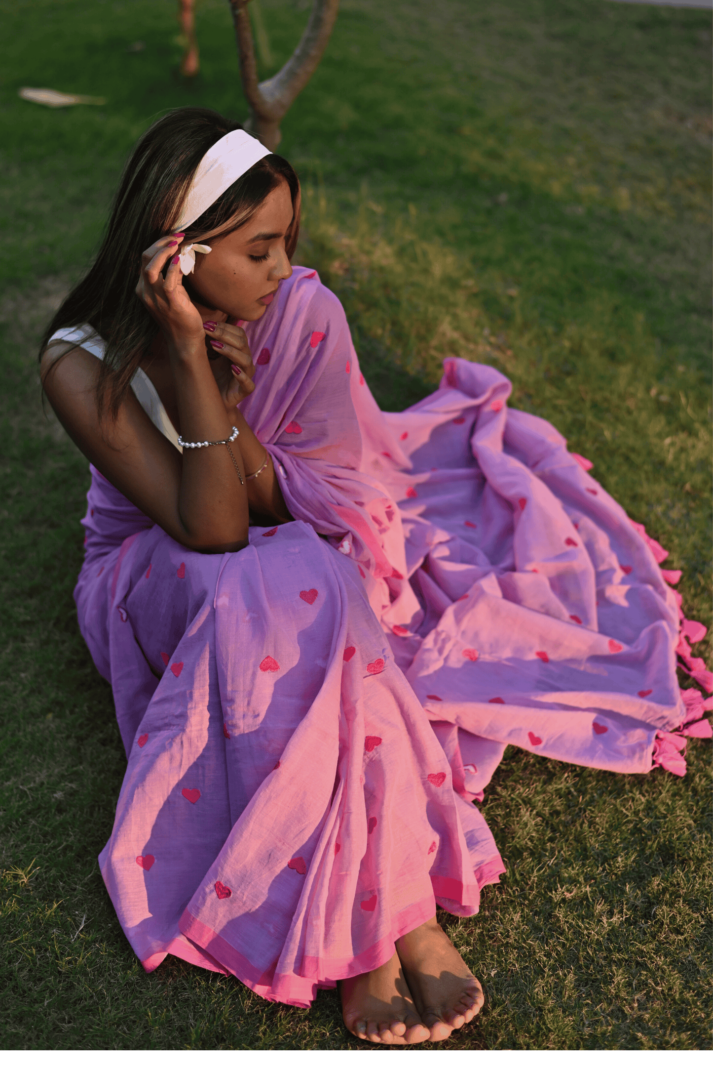 Fall in love with our quirky yet classy pure mul cotton saree, adorned with an enchanting all-over heart embroidery. This unique piece effortlessly blends simplicity with style, making it a standout choice for the modern woman. The soft, breathable mul cotton ensures comfort, while the playful heart motif adds a touch of whimsy. Embrace your individuality with this versatile saree that effortlessly transitions from day to night. The saree is pink and lime green in colour and doesn't come with blouse piece.