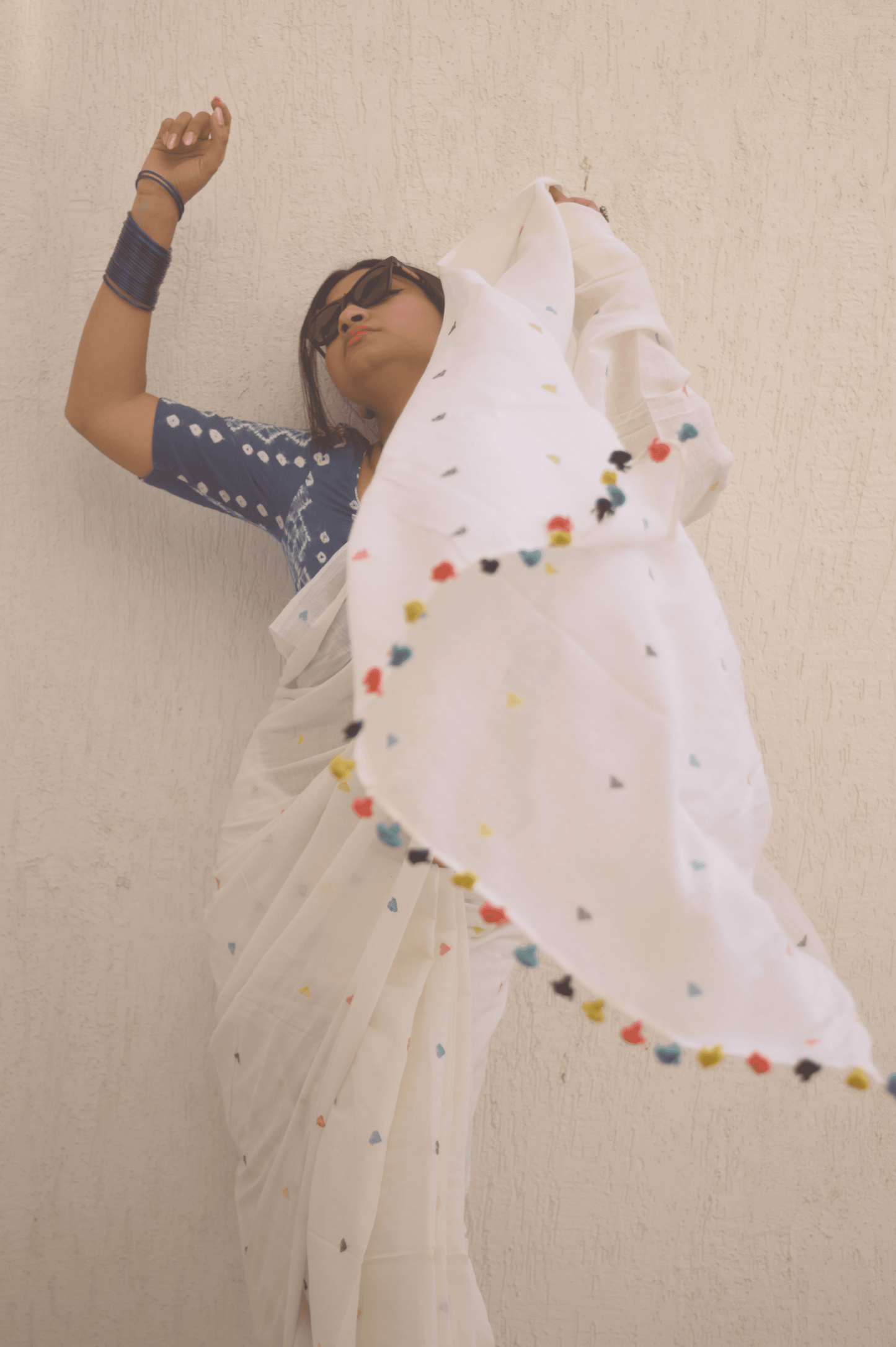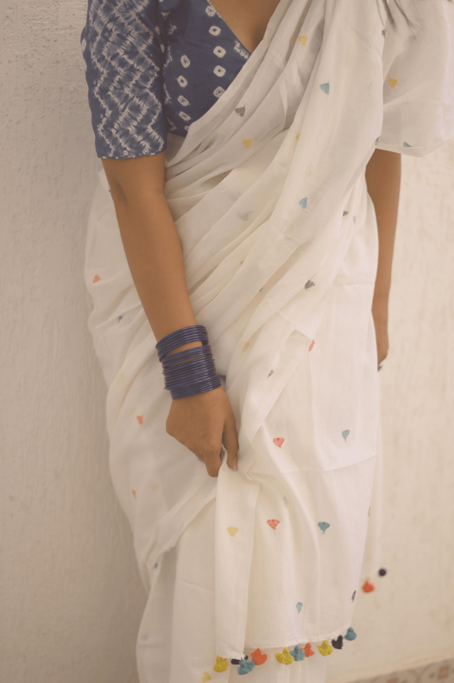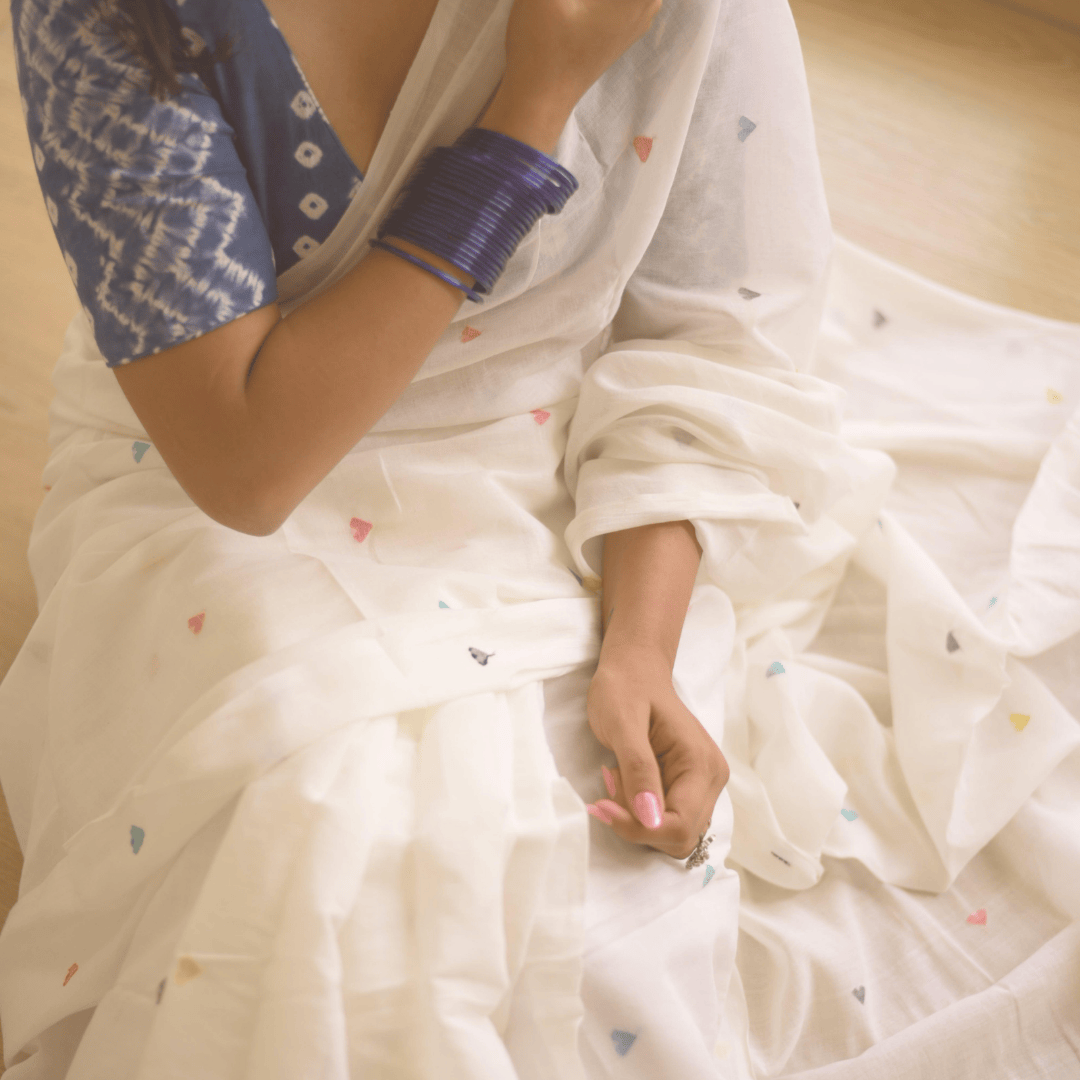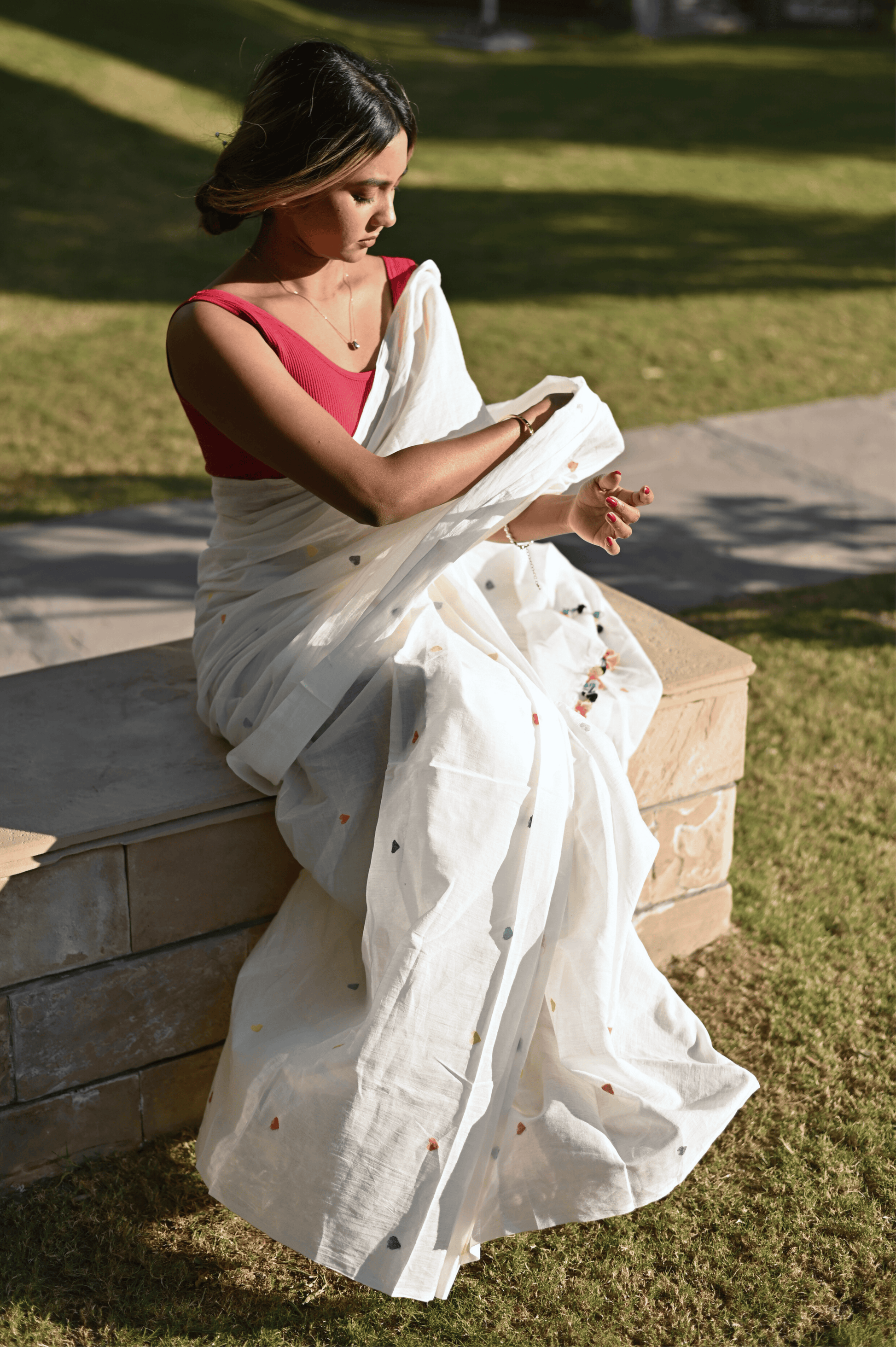Step into timeless elegance with our exquisite handwoven Jamdani Saree, adorned with hundreds of hearts in multiple colours on a bed of finest muslin cotton. The comfort of the ultra soft and easy to drape pure muslin cotton and the elegance of the handwoven motifs are sure to earn you compliments while you feeling at your best. Elevate your style with this luxurious saree and embrace the essence of heritage with every graceful movement. The saree has taken 90+ working hours on the handloom.