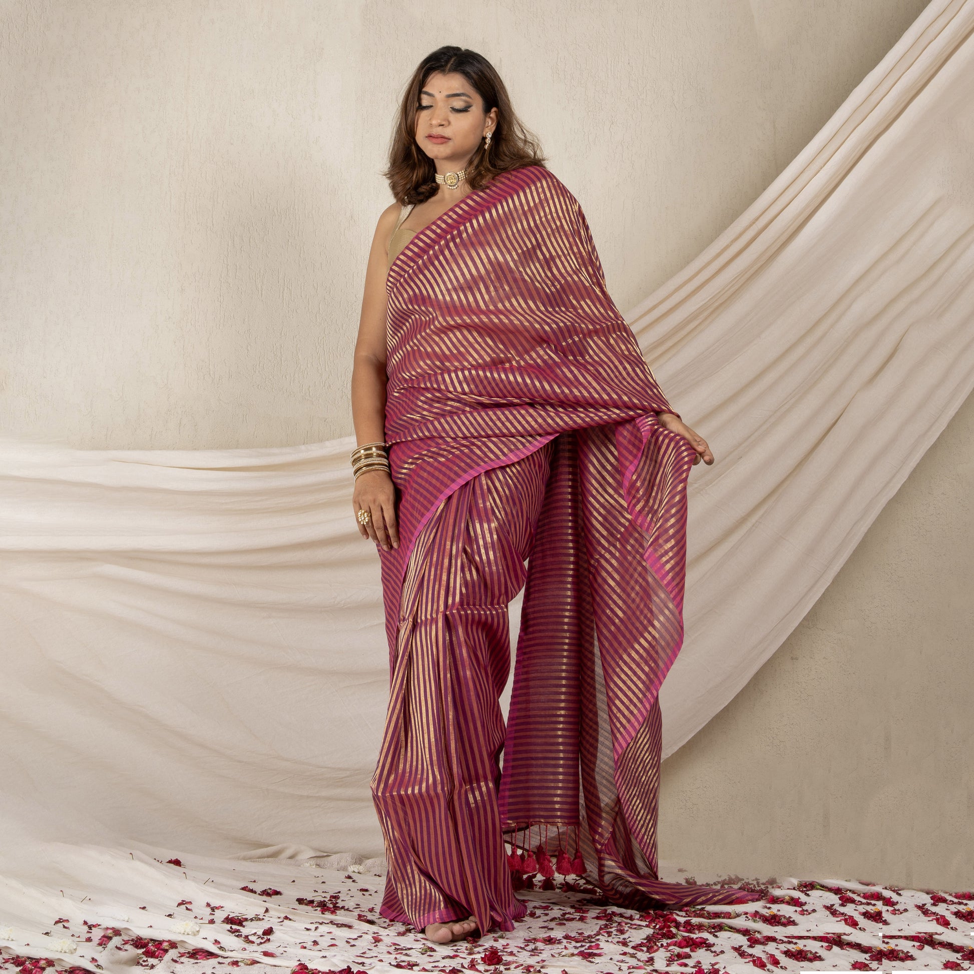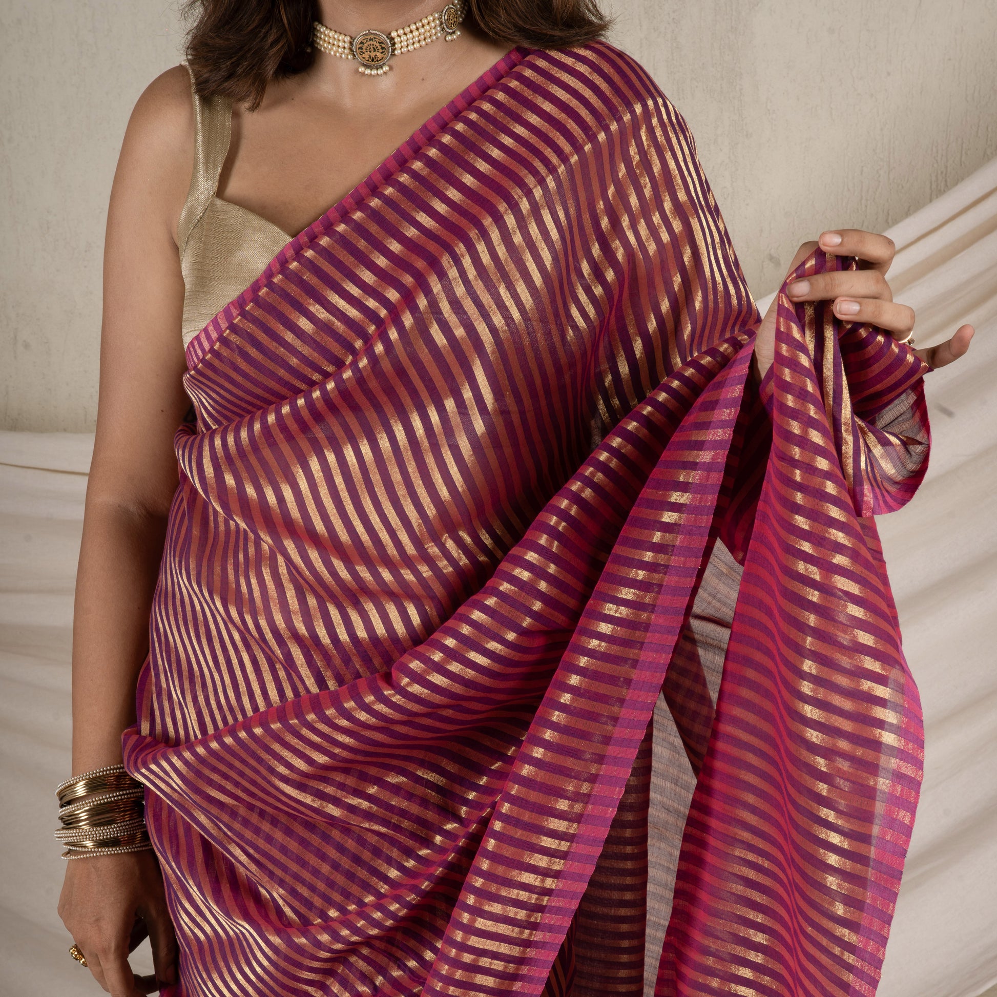 The brilliance of magenta merging with gold gives this saree its resplendent glow — subtle yet striking, festive yet elegant. Its zari-striped pattern adds a touch of grandeur without ever losing its refined grace, making it perfect for every celebration where you want to shine with understated class.
