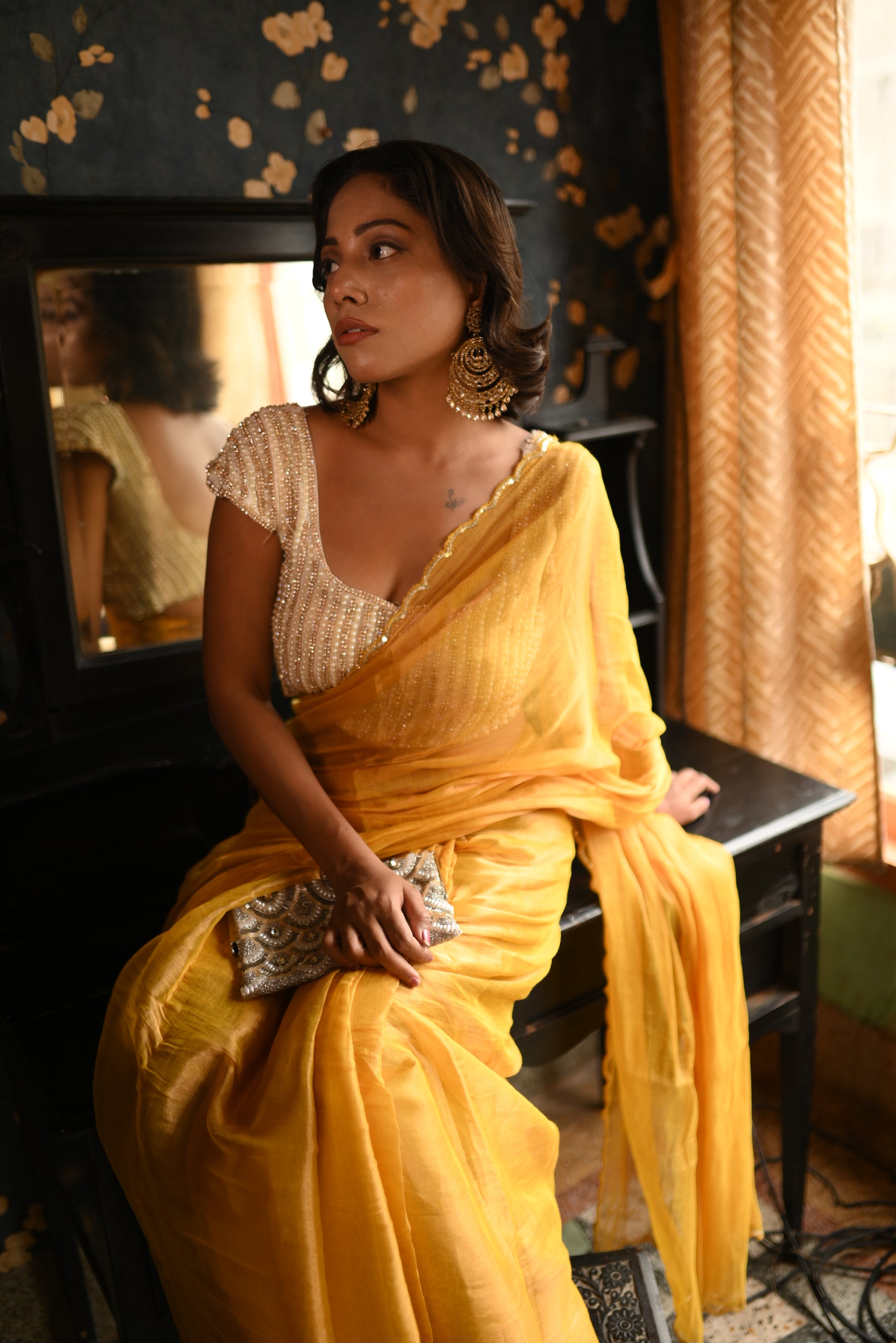 This saree is 100% handwoven and hand-embroidered in 60+ hours. Miss Earth is soft and flowy in earthy yellow hue. This saree won't bulk up and is going to drape perfectly.