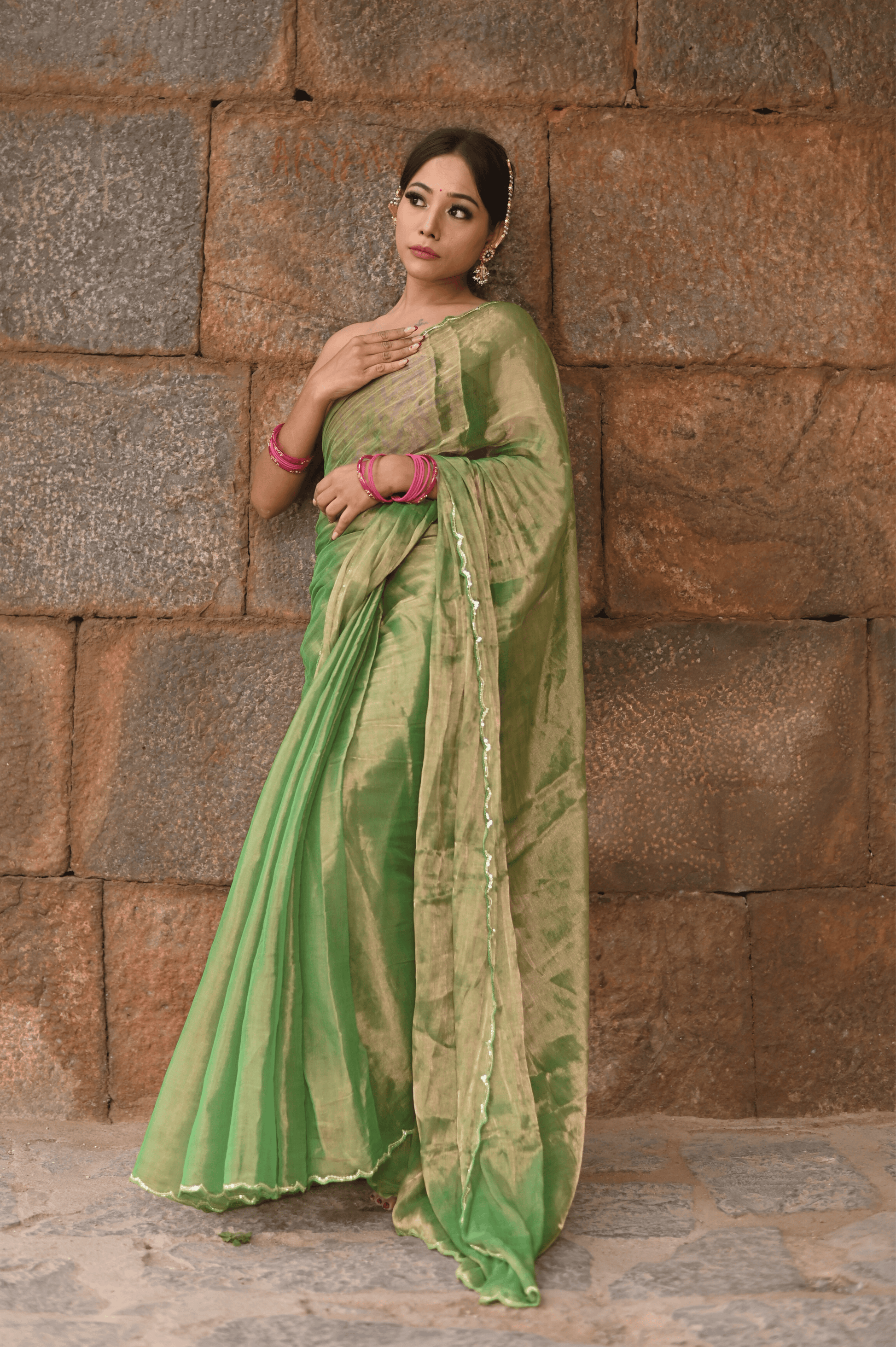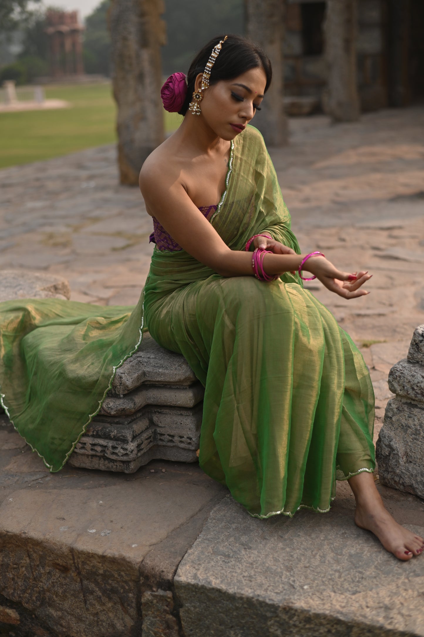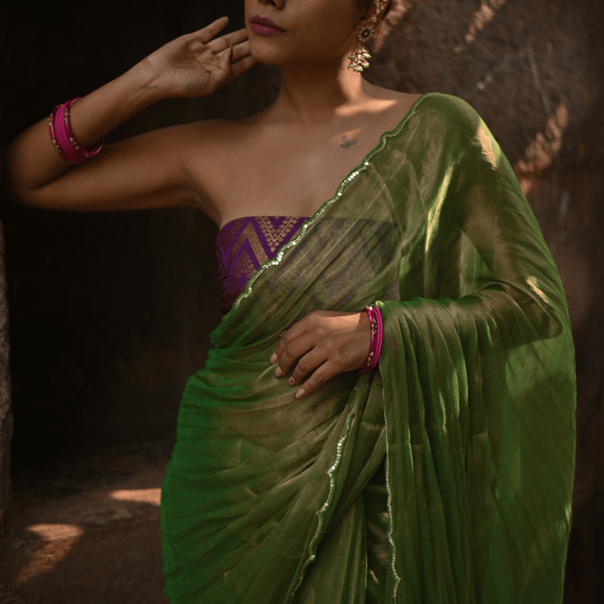 Experience the ethereal beauty of our handloom tissue saree, crafted with the finest pure mul cotton and adorned with shimmering zari. The delicate hand embroidery on the borders, embellished with sequins and resham, adds a touch of regal charm. The intricate cutwork on the edges further elevates its allure.