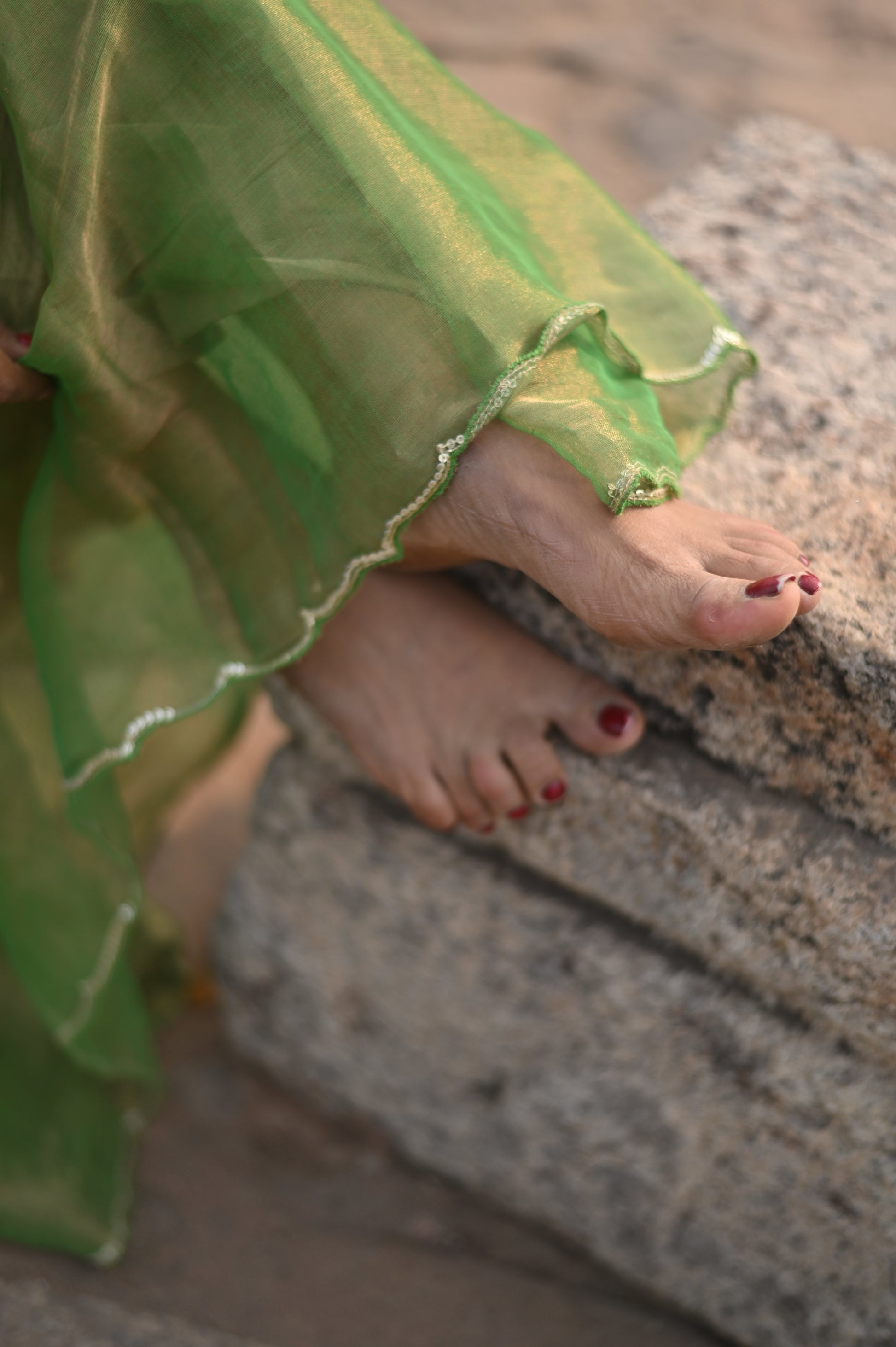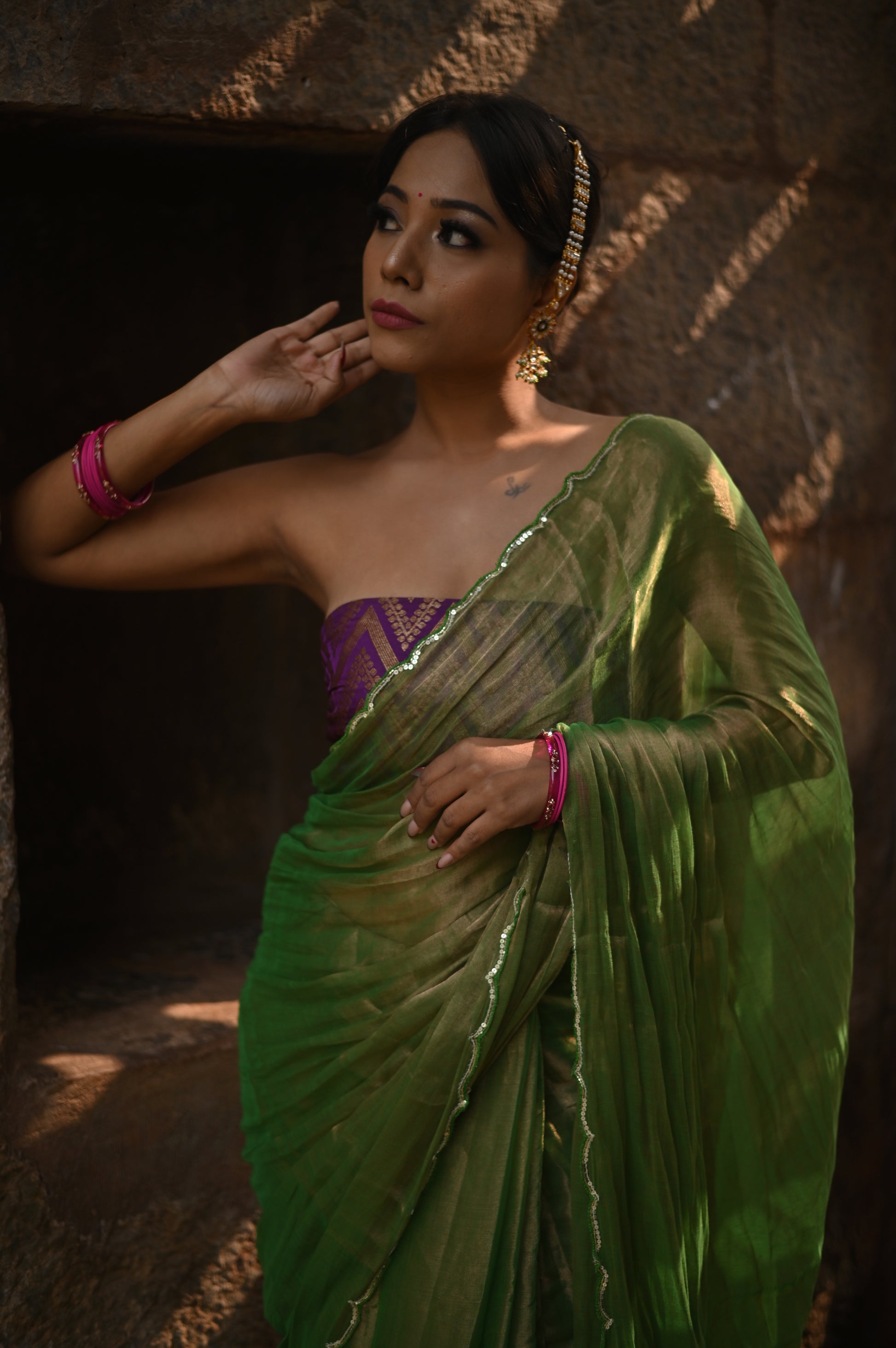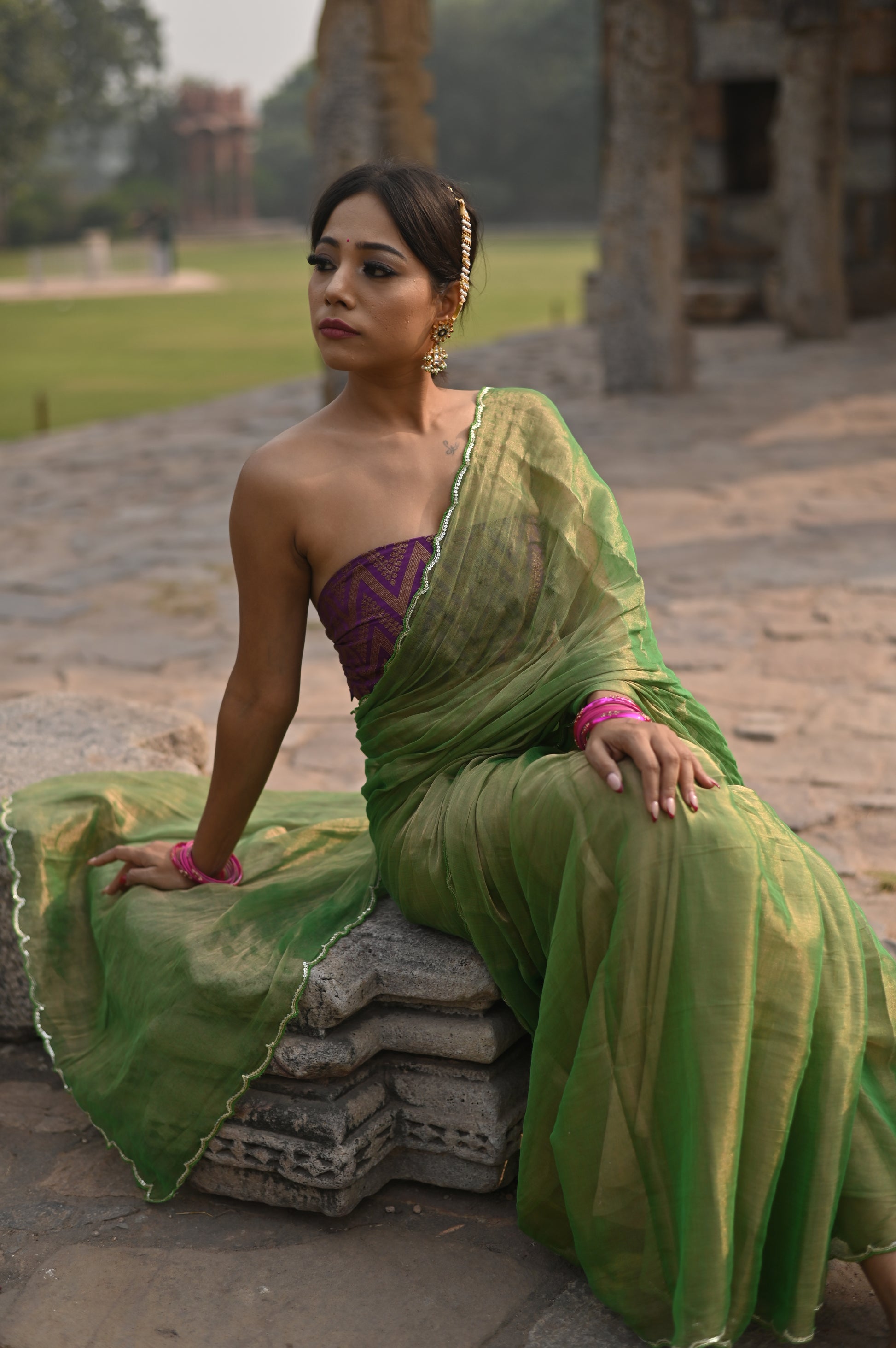 Experience the ethereal beauty of our handloom tissue saree, crafted with the finest pure mul cotton and adorned with shimmering zari. The delicate hand embroidery on the borders, embellished with sequins and resham, adds a touch of regal charm. The intricate cutwork on the edges further elevates its allure.