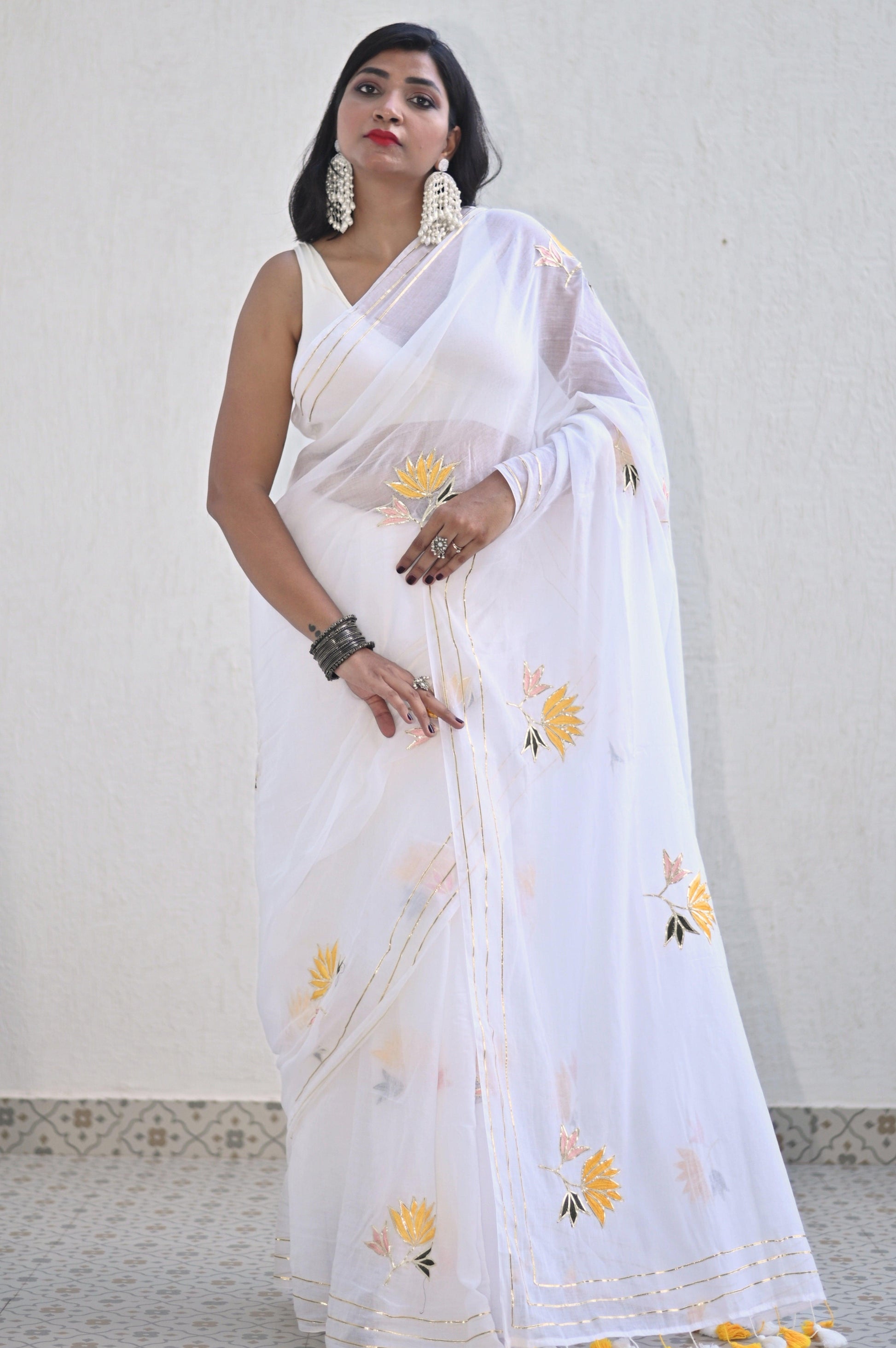 Indulge in the ethereal elegance of moonlit lotus mulmul saree, a graceful ensemble that epitomizes timeless beauty. Crafted with utmost finesse, this saree is a celebration of delicate craftsmanship and feminine allure. The soft, flowing fabric of mulmul drapes effortlessly, enveloping you in sheer comfort while exuding an aura of sophistication. The white base evokes sophistication, casting a serene and enchanting spell wherever you go. What truly sets this saree apart are the exquisite floral motifs delicately hand-embroidered across its expanse. Each petal and leaf is meticulously crafted by skilled artisans, infusing the saree with a mesmerizing charm that captivates the beholder. Whether you're attending a daytime soiree or a formal evening affair, this mulmul saree is sure to make a statement. Pair it with minimalistic jewelry for a classic look or accessorize with bold accents to add a contemporary twist.