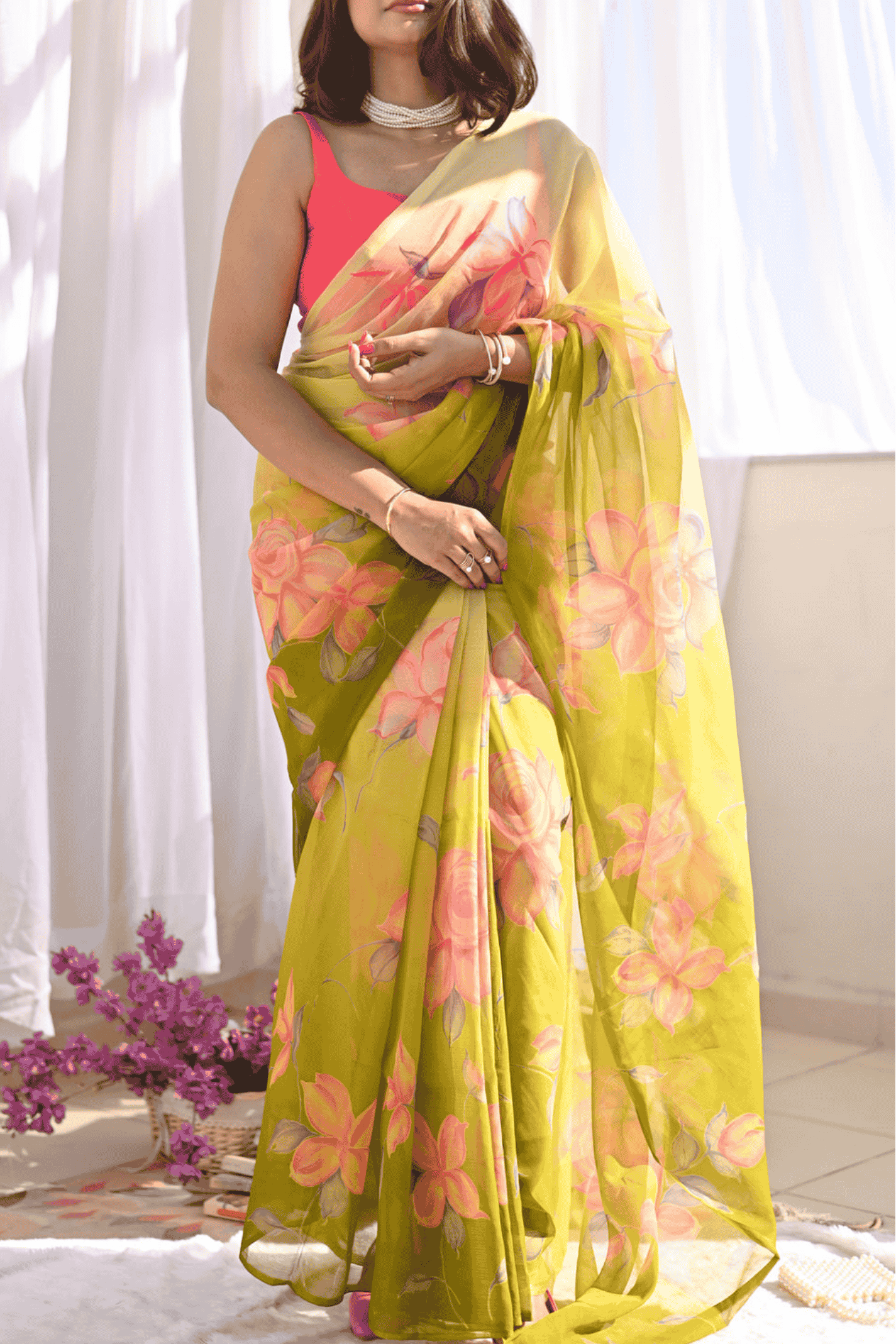 Imagine a saree that feels like a gentle breeze against your skin, a whisper of vibrant color that elevates your everyday style. Olivia Chiffon Saree is designed for the modern woman who seeks both beauty and comfort. Crafted from feather-light chiffon, this saree is incredibly easy to drape, allowing you to move with grace and confidence throughout your day. A symphony of stunning floral prints adorns the fabric, bursting with captivating hues that capture the essence of a blooming garden.