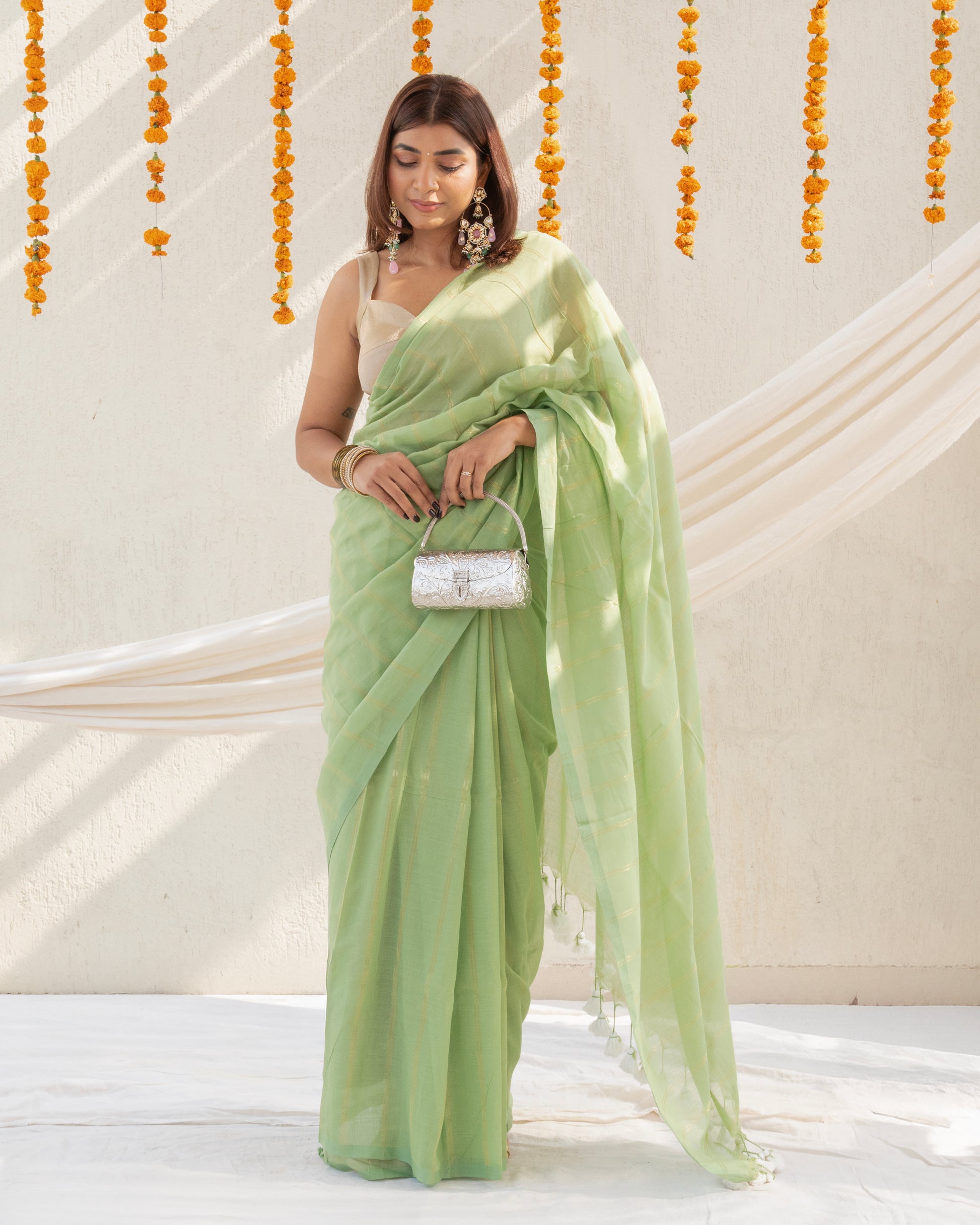 Handwoven in pastel hue pure cotton and zari, this drape brings together the lightness of pastel hues with the understated brilliance of golden stripes. The warp of cotton meets the weft of shimmering zari, each line of weave taking shape through over 50 patient hours on the loom