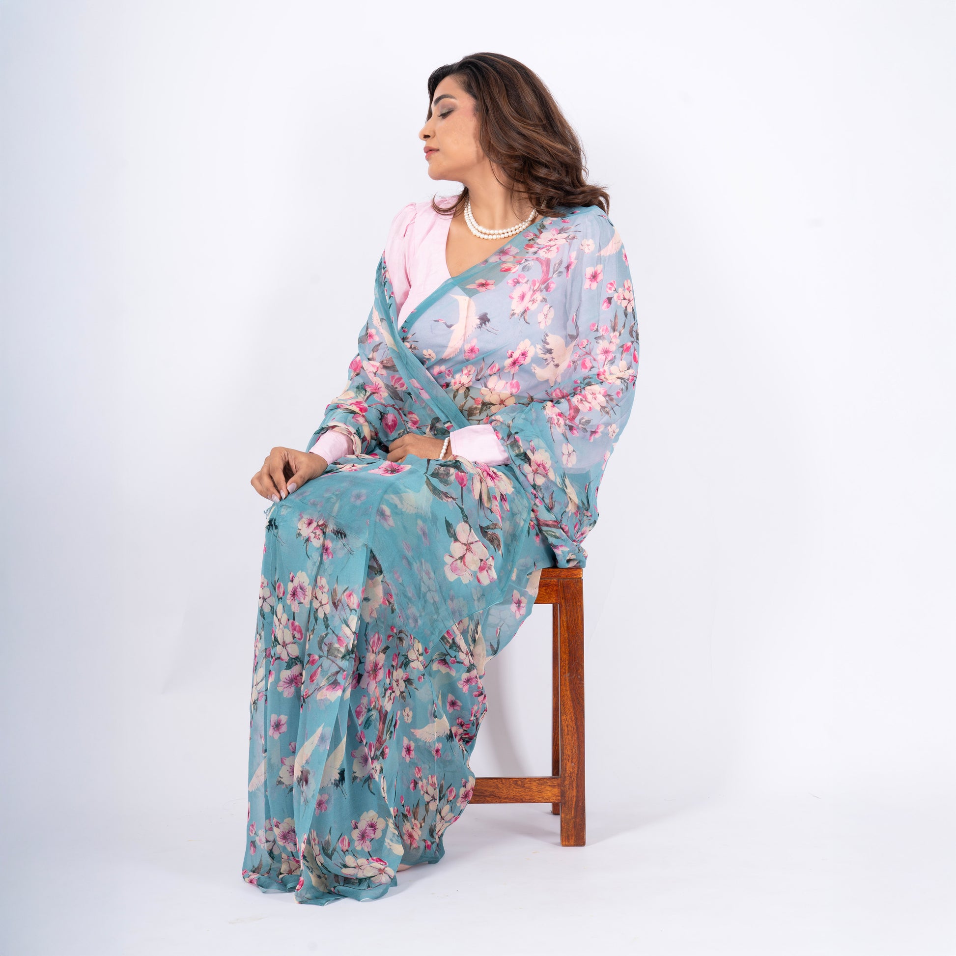 Sakura is crafted in pure chiffon, feather–light and flowing, with an all–over digital print of cherry blossoms and birds that feels like poetry on fabric. Set against a soft English muted blue, the blossoms bloom in gentle pinks, lending the saree a graceful, feminine aura.