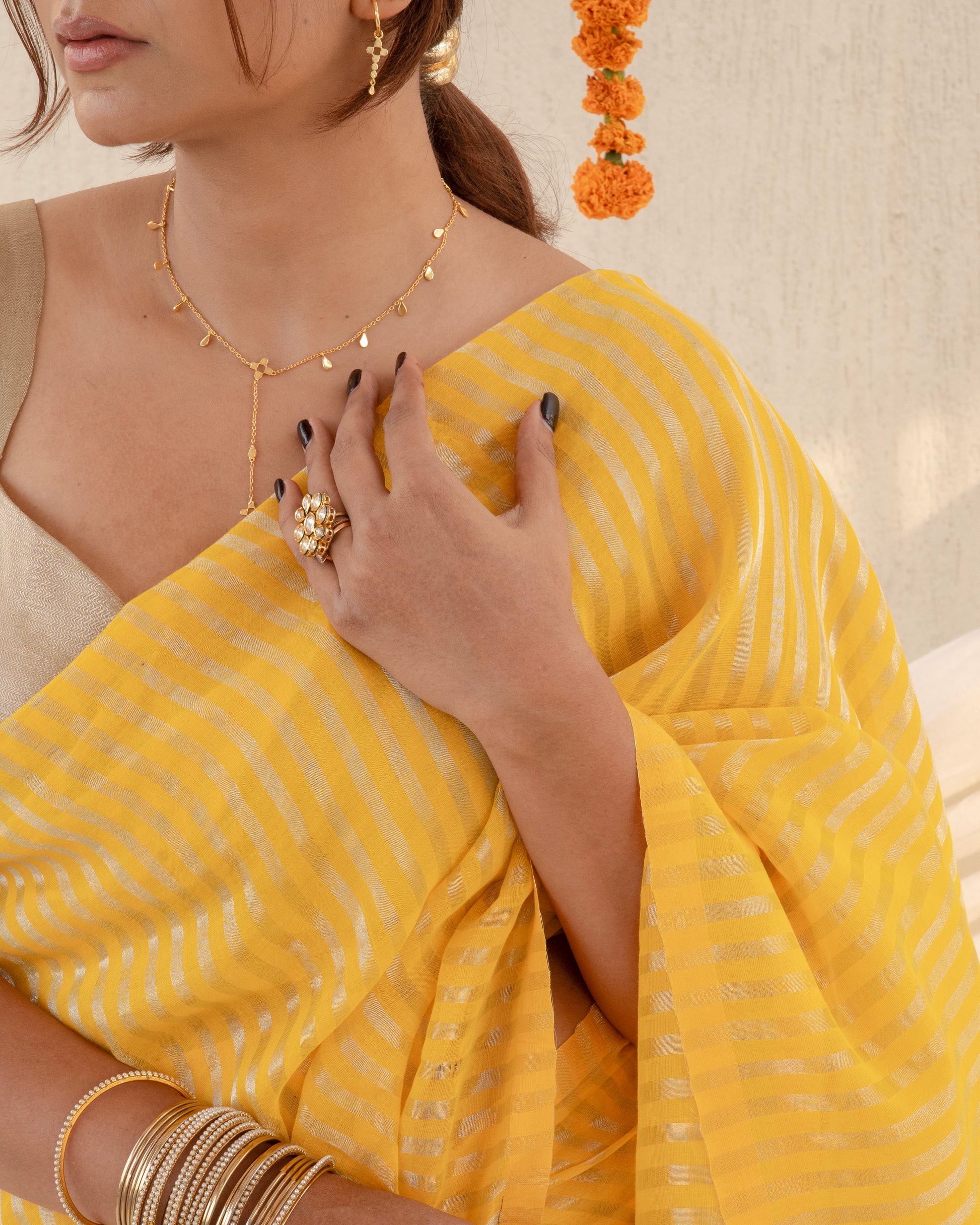 The brilliance of yellow merging with gold gives this saree its resplendent glow — subtle yet striking, festive yet elegant. Its zari-striped pattern adds a touch of grandeur without ever losing its refined grace, making it perfect for every celebration where you want to shine with understated class.