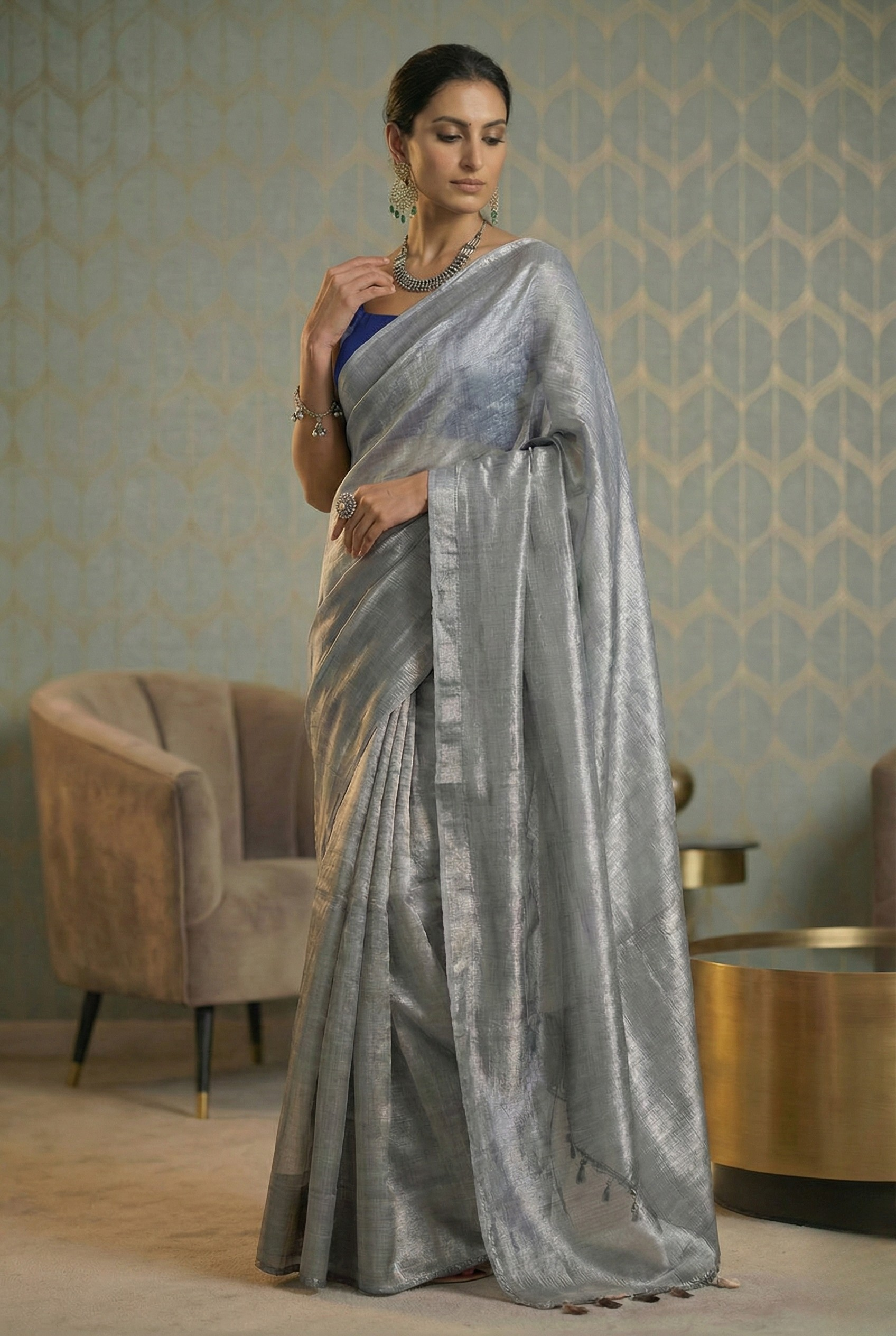 Silver Handloom Linen Tissue Saree