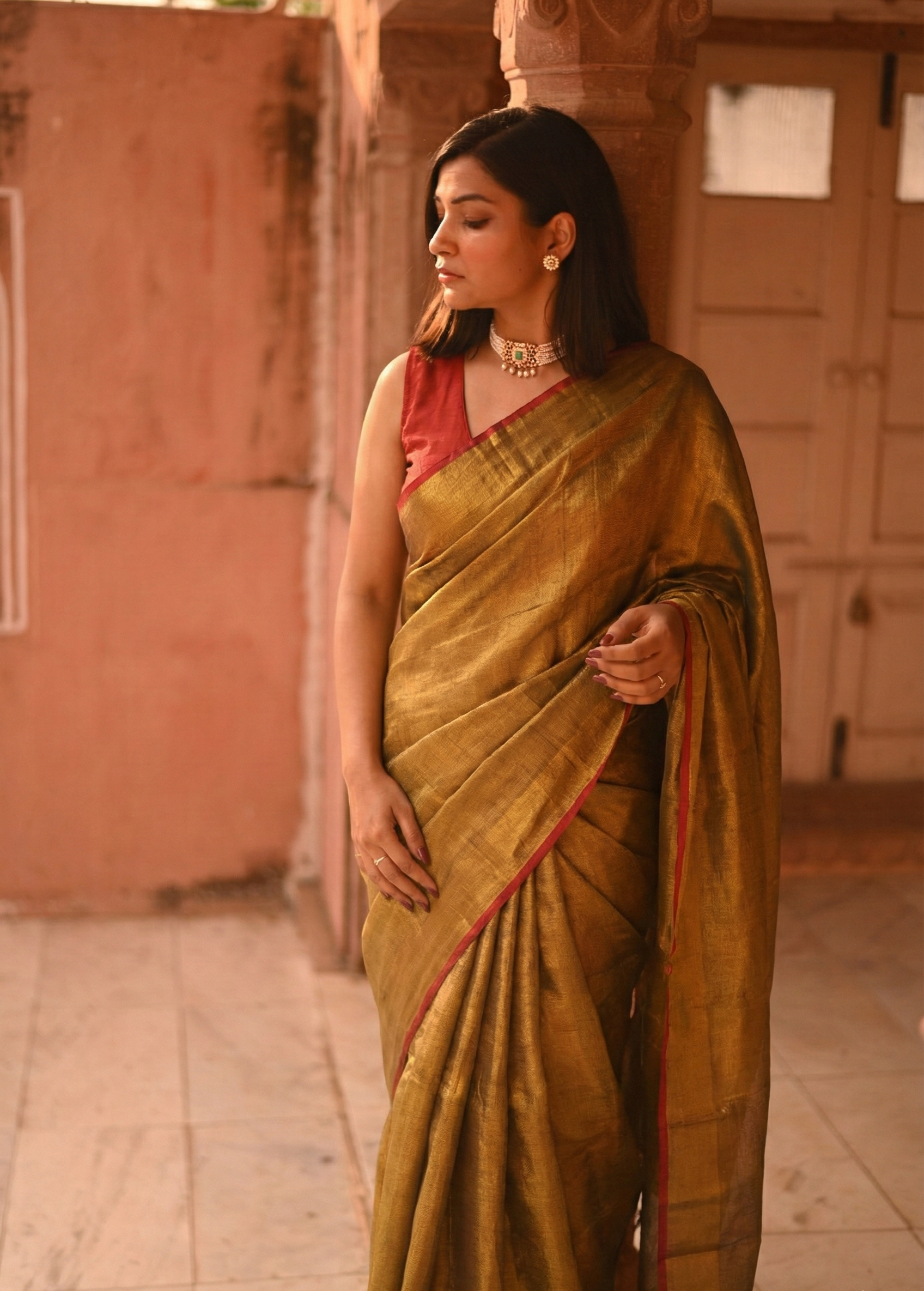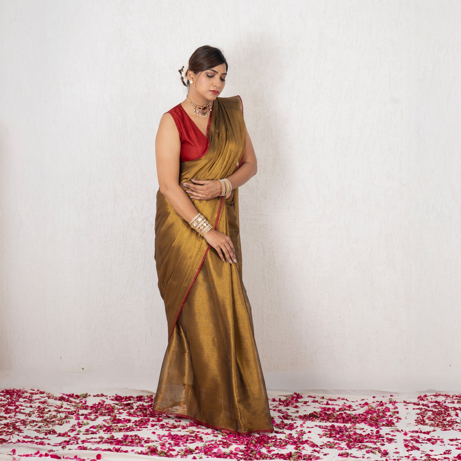 Whether you're attending a special occasion or simply want to elevate your everyday look, this saree is sure to make you stand out in the crowd. So why wait? Embrace the timeless allure of our gold Tissue Saree and make a statement wherever you go.