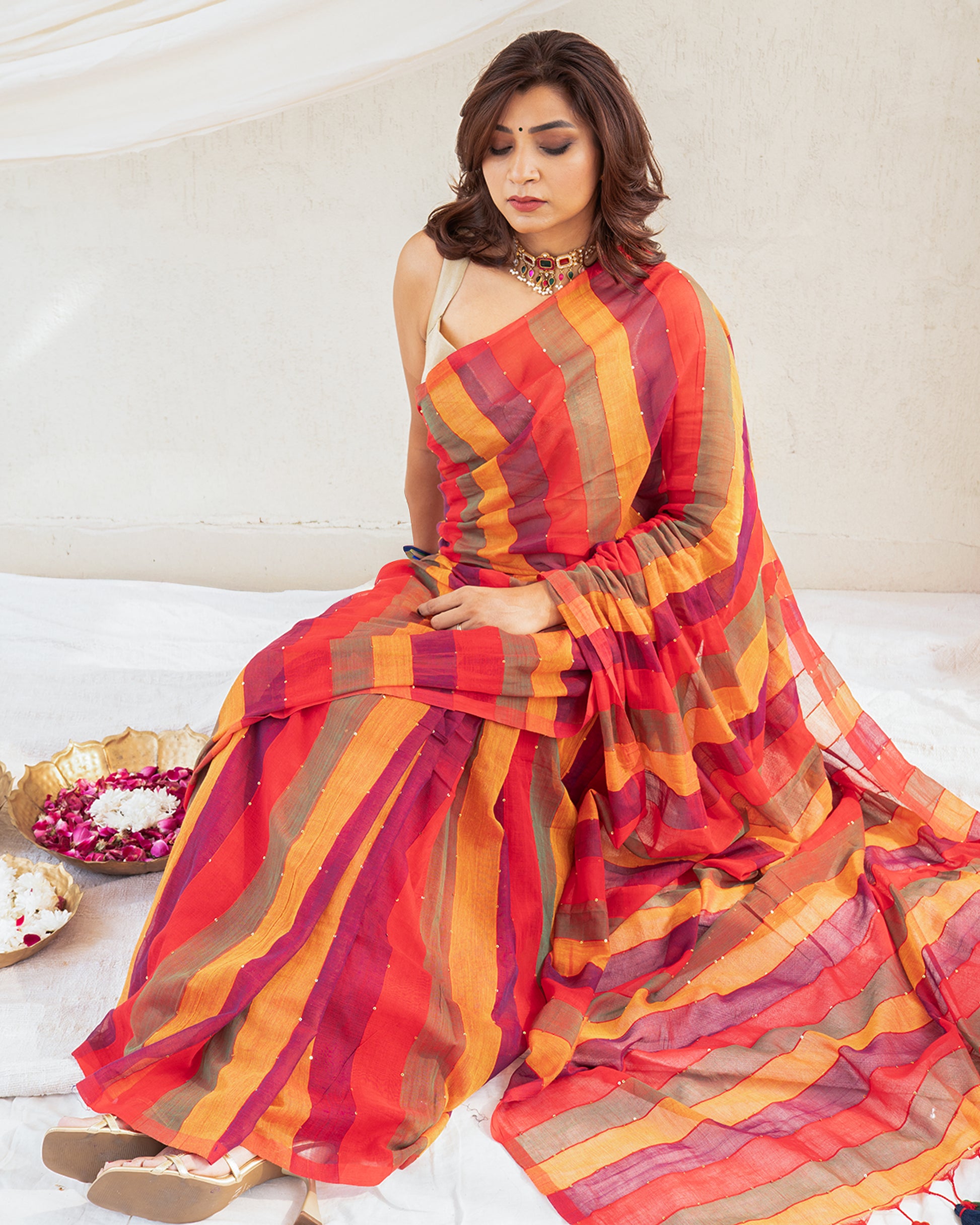 This saree is handwoven in pure cotton with Sequins woven into it, where the weft carries a dance of multicolored cotton threads. Each shade flows seamlessly into the next, creating a drape that feels alive with festive energy. The warp of cotton meets this vivid weft in harmony, and together they take over 50 hours on the loom to come to life.