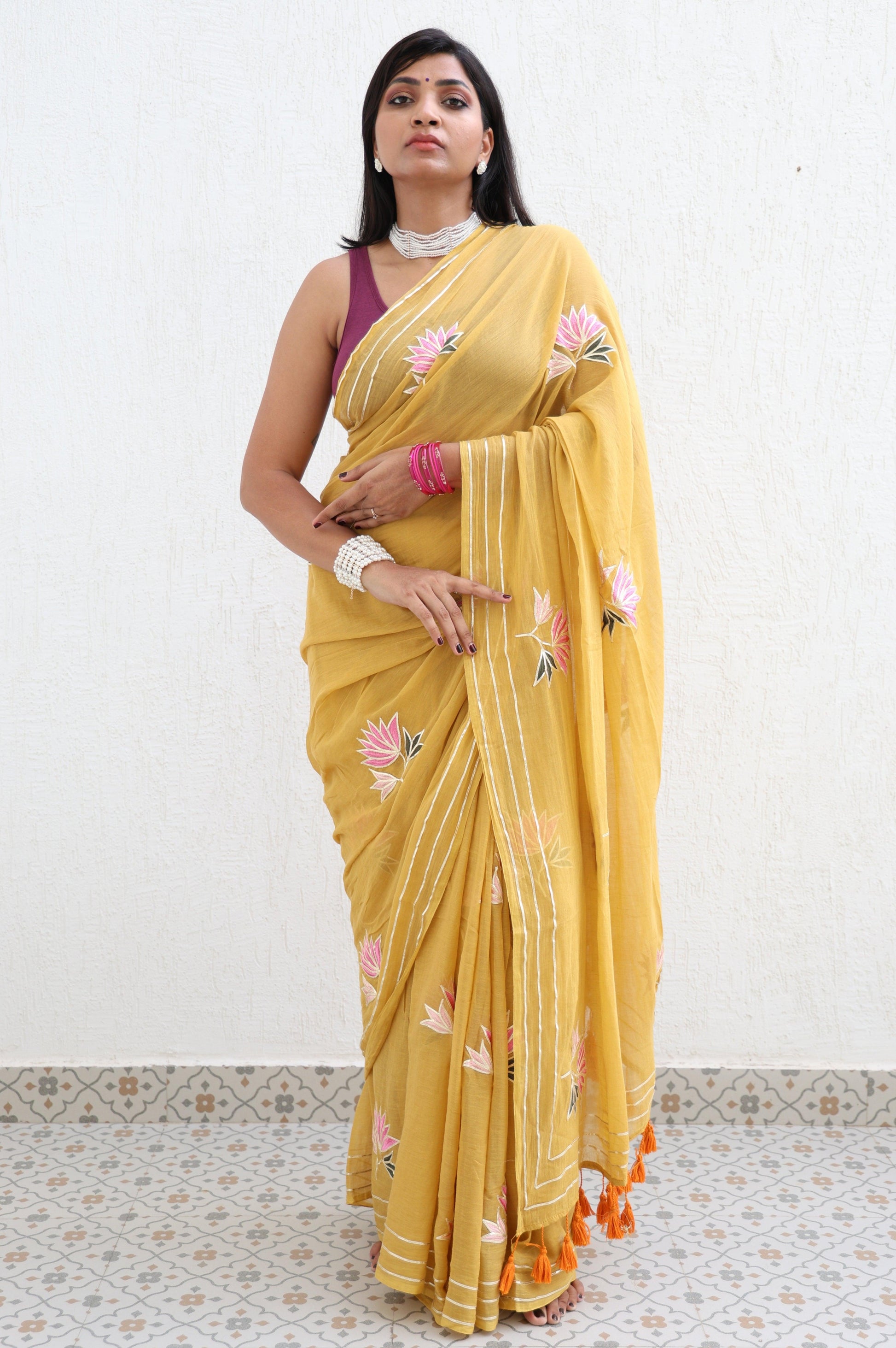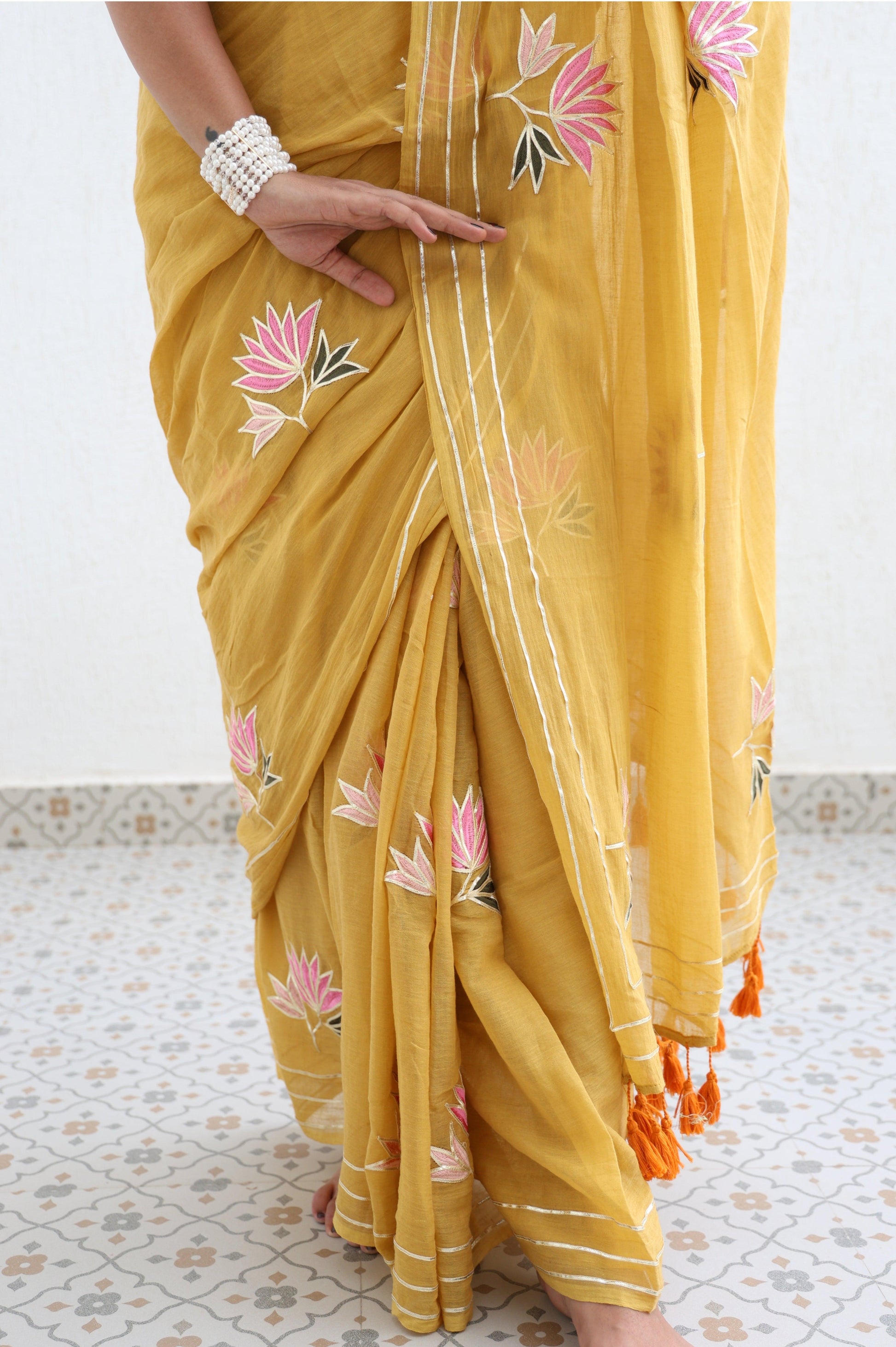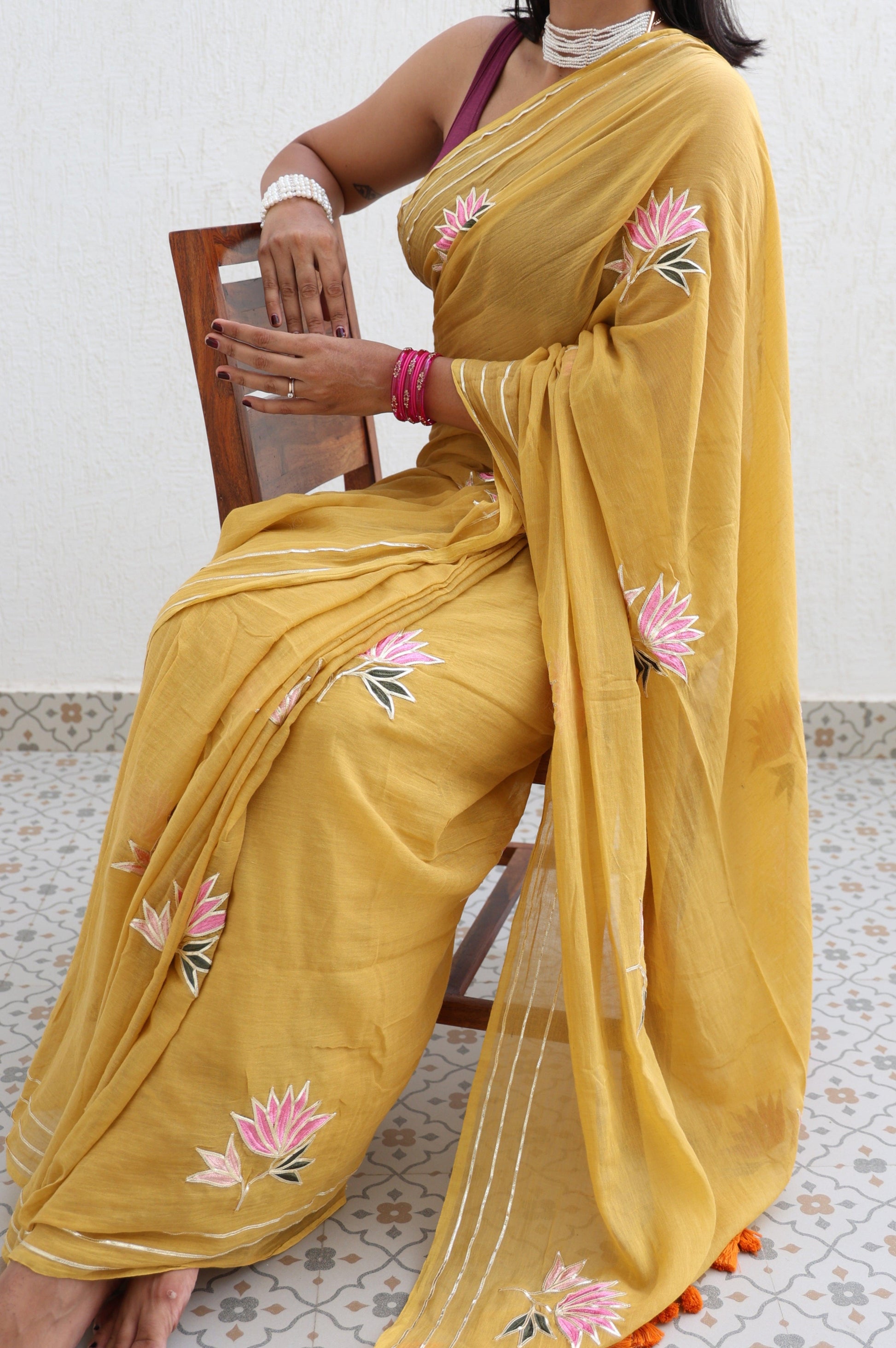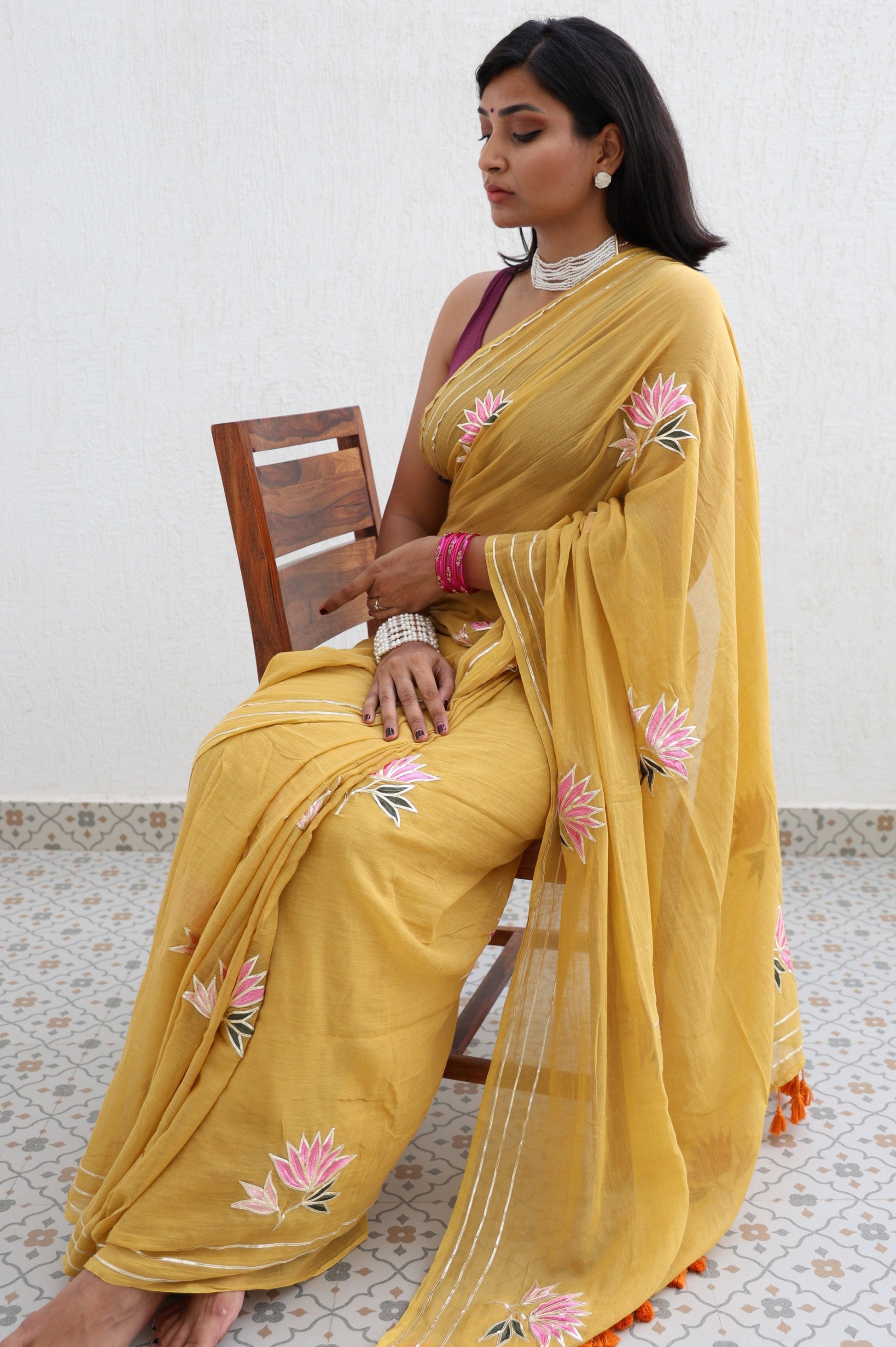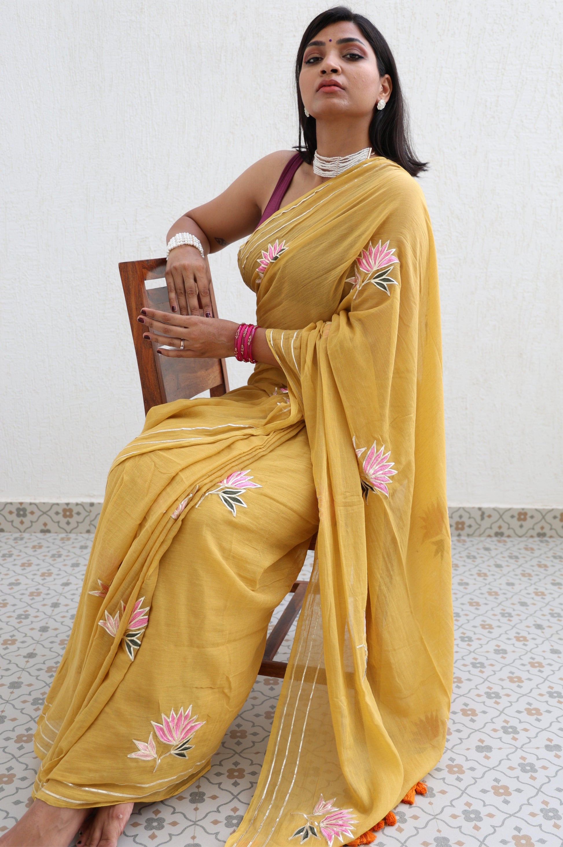 Indulge in the ethereal elegance of walking on sunshine mulmul saree, a graceful ensemble that epitomizes timeless beauty. Crafted with utmost finesse, this saree is a celebration of delicate craftsmanship and feminine allure. The soft, flowing fabric of mulmul drapes effortlessly, enveloping you in sheer comfort while exuding an aura of sophistication. Its subtle mauve hue evokes sophistication, casting a serene and enchanting spell wherever you go. What truly sets this saree apart are the exquisite floral motifs delicately hand-embroidered across its expanse. Each petal and leaf is meticulously crafted by skilled artisans, infusing the saree with a mesmerizing charm that captivates the beholder. Whether you're attending a daytime soiree or a formal evening affair, this mulmul saree is sure to make a statement. Pair it with minimalistic jewelry for a classic look or accessorize with bold accents to add a contemporary twist.